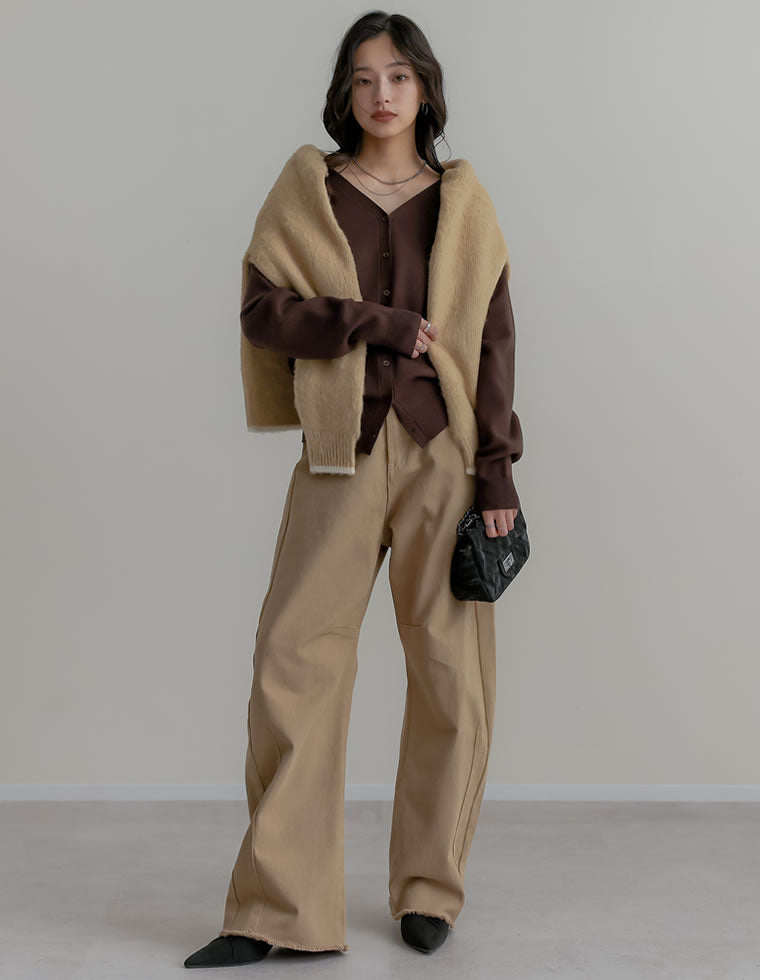 ブラウンのパンツやスカートは、ブラックのような引き締め感を持ちながら、どこか柔らかく女性らしい印象に仕上がります。センタープレス入りのワイドパンツや、フレアパンツもブラウンなら一気に旬顔に。ロングスカートも、ツイルやスウェード調など素材に表情があると、秋冬らしい深みが加わります。ニットやシャツなどベーシックなトップスを合わせるだけで、こなれた大人のカジュアルスタイルに。