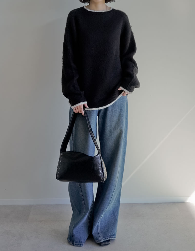 シンプルな黒ニットも、シャギー素材などのディテールで差をつけたり、シャツやカットソーをレイヤードするのが大人の着こなし。オールブラックにならないよう、やや明るめのトーンを合わせると、抜け感と品の良さを両立できます。もちろんカジュアルなデニムとも相性抜群です。