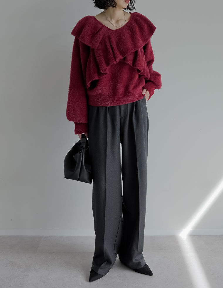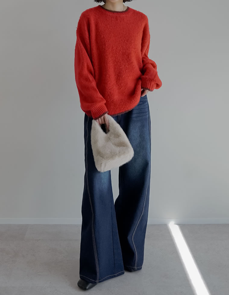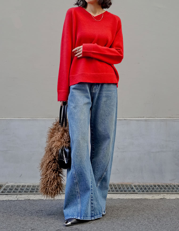 秋冬コーデのアクセントとして人気のレッド。深みのあるボルドーやチェリーレッドなど、肌なじみのよいカラーを選べば取り入れやすさも◎主張が強めなカラーなので、シンプルなシルエットや落ち着いた素材感で大人らしさをキープするのがポイントです。デニムにはもちろん、ベージュやブラウンのスラックス、グレーのボトムなどと合わせるとバランスよく着こなせます。