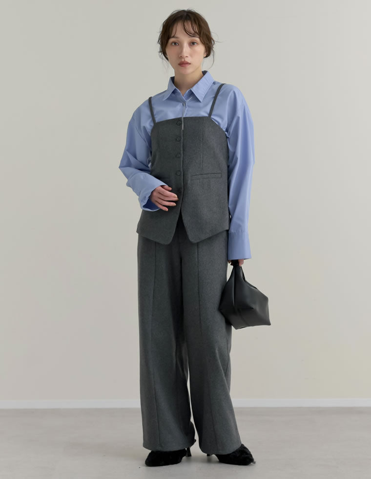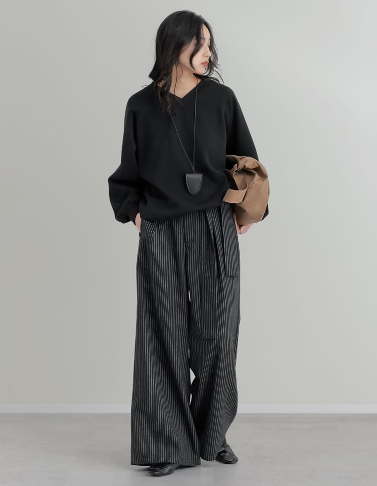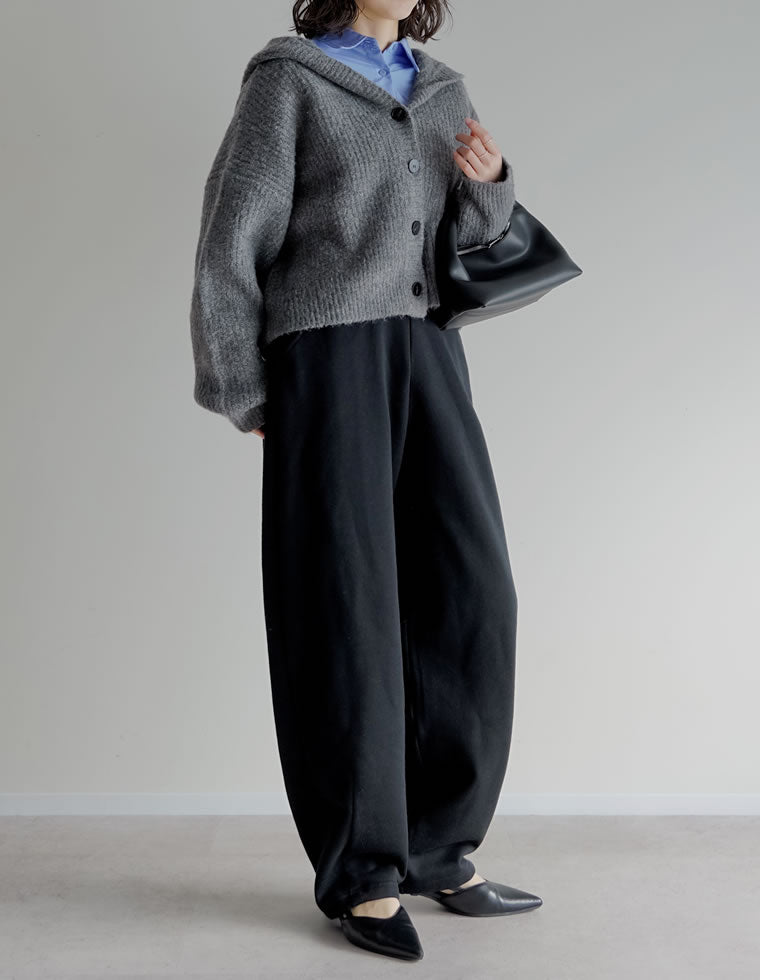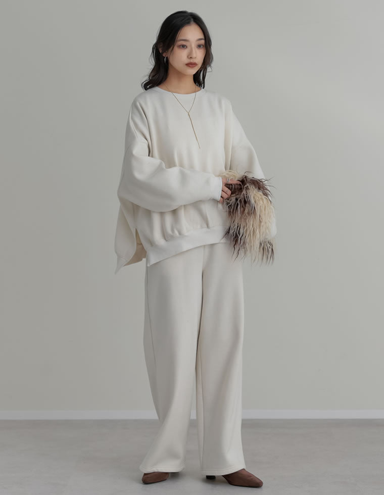 シンプルなワイドパンツを裏起毛素材でお作りしました。 あえてセットアップできるトップスを合わせて、小物やシューズで抜け感を出すのがおすすめの着こなし。 程よくハリのある生地×レッグラインを拾いづらいシルエットで美脚見えを叶えます。