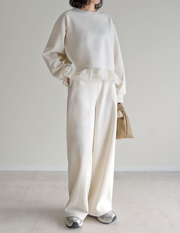 カジュアルなスウェットに、繊細なフリルデザインをプラスしてさりげない甘さをプラス。 30代・40代でも取り入れやすい、大人フェミニンな冬の着こなしが叶います。 同生地のスカート(商品番号:140027)パンツ(商品番号:139381/140026)とのセットアップの他、ベーシックなデニムと合わせても◎