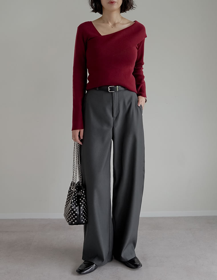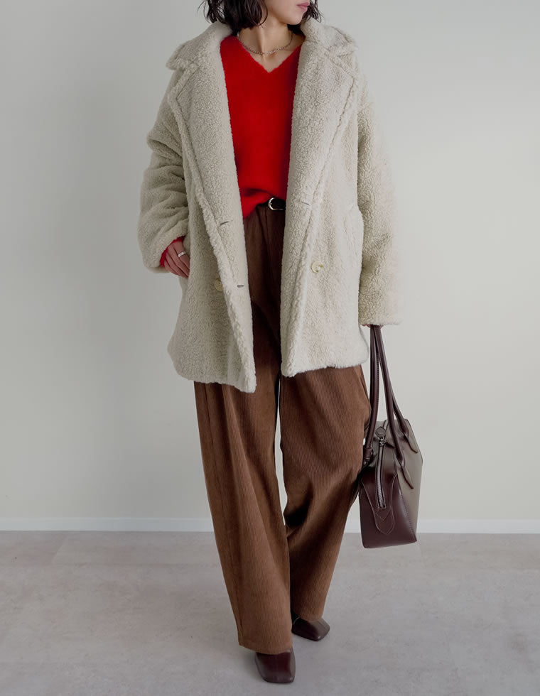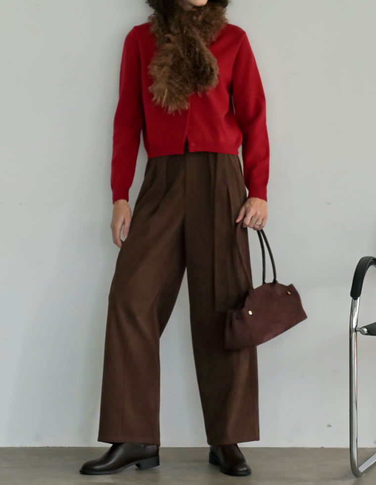 秋冬のスタイリングに活躍するコーデュロイパンツ。 ウエストベルトつきのデザインだから、カジュアルになりがちなコーデュロイパンツコーデにモードな要素が加わります。 暖かみのある真っ赤なニットでシーズンムードたっぷりに着こなして。