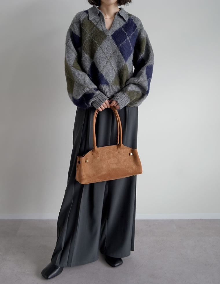 シンプルなパンツスタイルにもアクセントになってくれる、ボックスプリーツタックパンツ。 動くたびにタック部分が開き、シンプルなアイテムを合わせても、さまになる。 トレンドのアーガイルチェックニットと合わせて、リラクシーなきれいめカジュアルが完成。