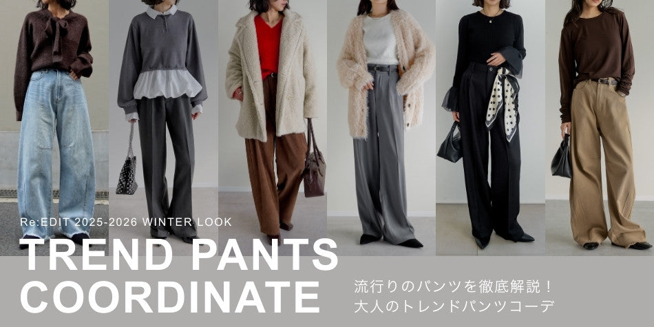 旬のシルエットやデザインはもちろんのこと、オフィスなどのきれいめシーンにも使えるパンツが勢ぞろいです。