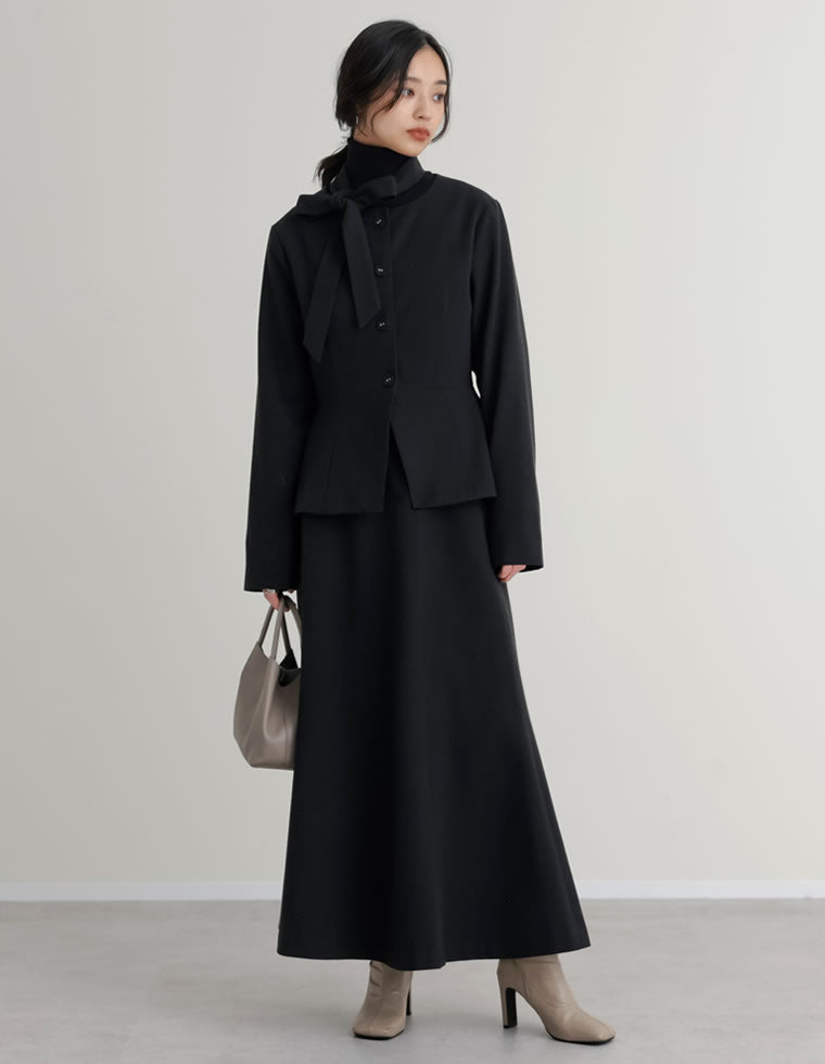 モード×レディに着こなせるオールブラックのセットアップ。 ウールライクな生地感で、冬らしい暖かみのある雰囲気も演出。 程よく立体感のあるジャケットとセミマーメイドスカートは、お出かけだけでなく、オフィスシーンでも印象良く見られること間違いなしです。