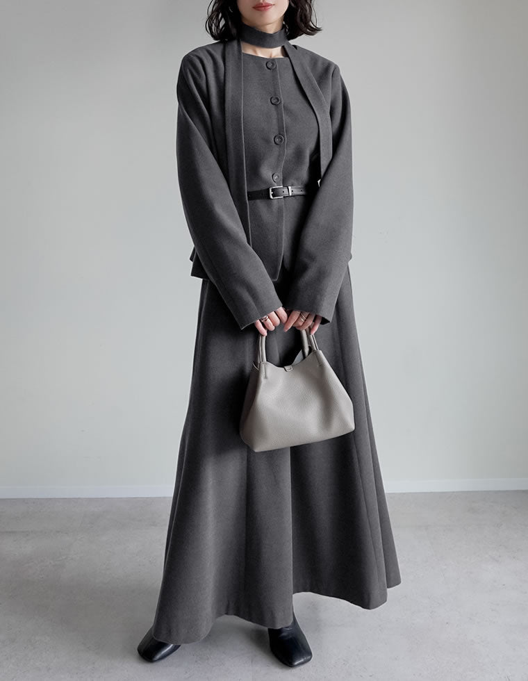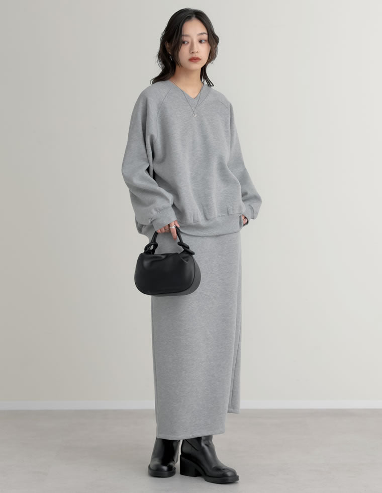 ホワイトよりも知的で、ブラックよりも優しい印象を与えるグレー。 グレーのワントーンコーデは、シルバーアクセサリーなどとも相性がよく華やぎアイテムとしても最適! ウールライク素材だから、寒い冬のお出かけにもぴったりのセットアップです。