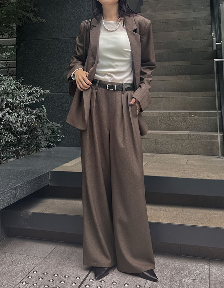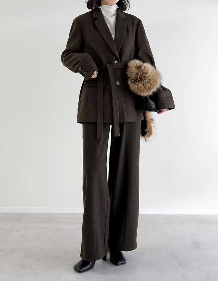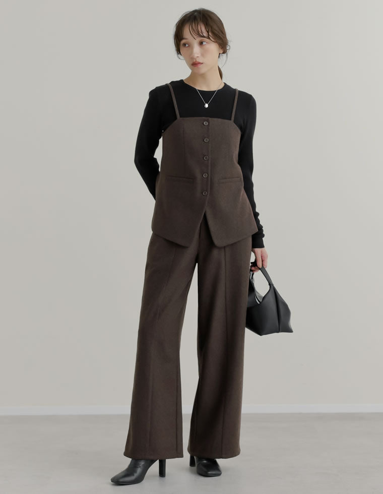 寒い時期に着たいブラウンのセットアップ。 程よい起毛感のあるウールライク生地を採用しており、ベーシックなデザインながらも洒落感たっぷり。 ビスチェ×パンツのセットアップなら、ジャケットのセットアップよりも手軽にややカジュアルに着られて大人のお出かけにぴったり。