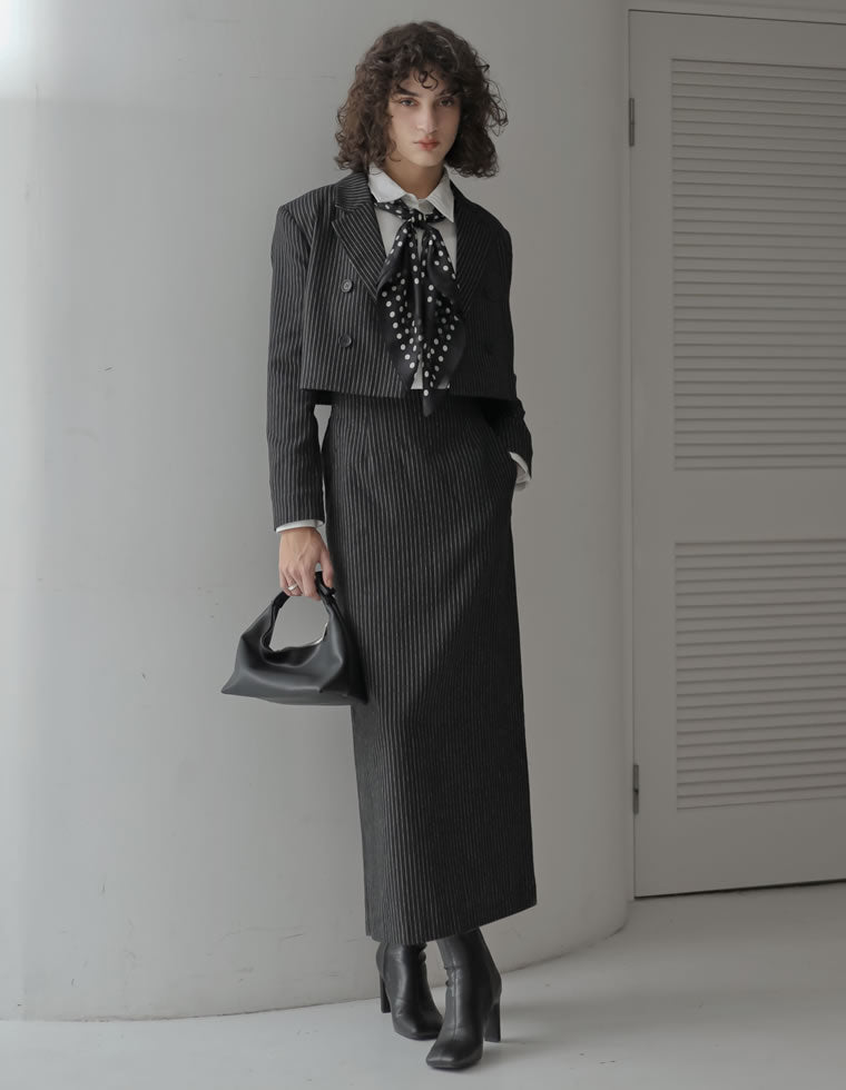 モードで知的な印象のストライプセットアップは、冬のホリデーシーズンのお出かけにぴったり。 インナーの合わせ方次第で、かっちり目にも華やか系にも着られるのが魅力。 目線を上に向けるコンパクトシルエットが女性らしいポイントです。