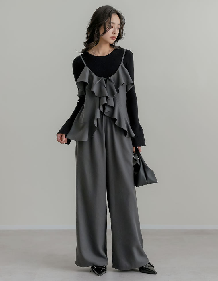 贅沢なフリルデザインで着映えるキャミセットアップ。 コンパクトなリブニットやカットソーなど、どんなインナーにもさっと合わせるだけで旬のコーディネートが完成◎ アウターに響きにくいキャミトップスは、何枚でも揃えておきたい大人のマストハブアイテム!