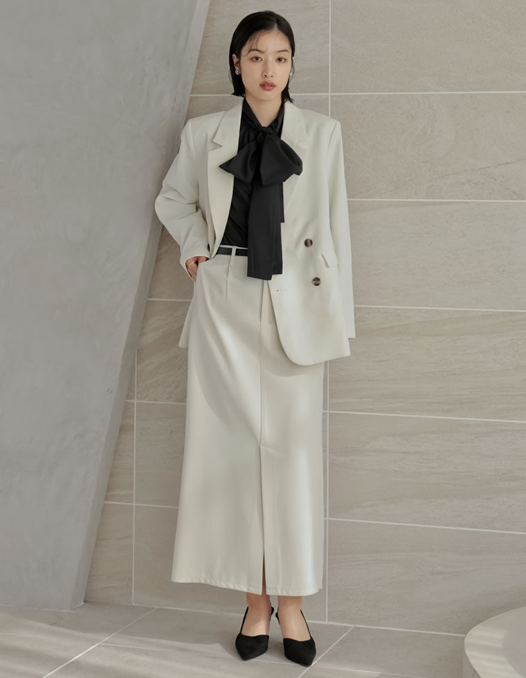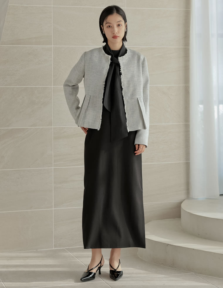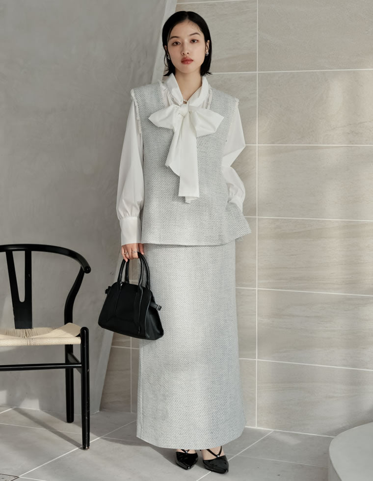 全4アイテムが登場したモノトーンツイードシリーズ。 ベスト、ジャケット、スカート、テーパードパンツが登場しました。 中でも、スカートスタイリングは、セットアップにするだけで女性らしく、きちんと感も演出。 すっきりとしたナローシルエットですが、バックゴム使用のため長時間の参列や移動、食事の際もストレスフリーで着こなせます。