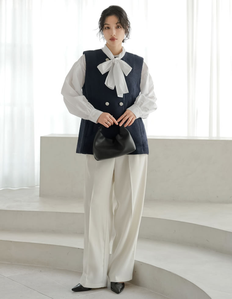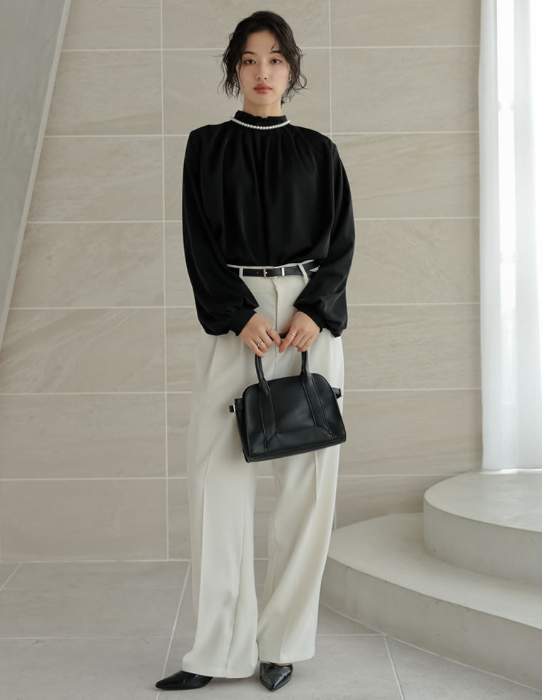 式典用のメインで着る服は決まっていても、アクセサリーや合わせるインナーで悩むことも多いですよね。 首元にディテールのあるシャツブラウスを合わせれば、肌見せを控えてきちんと見えしながら、お祝いの場に相応しい雰囲気を与えてくれます。 とろみのある素材感なら、1枚でも上品な印象に仕上がります。