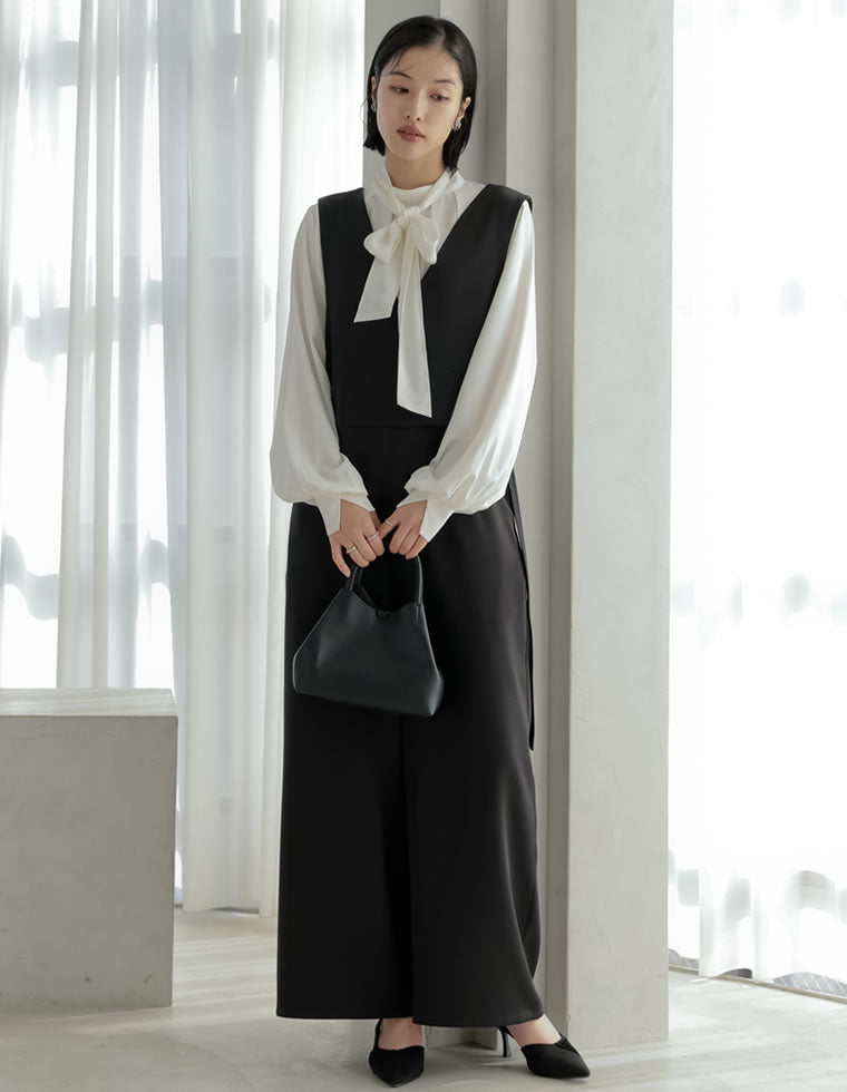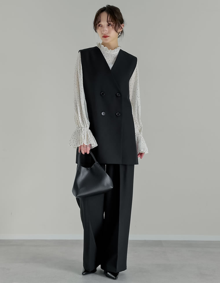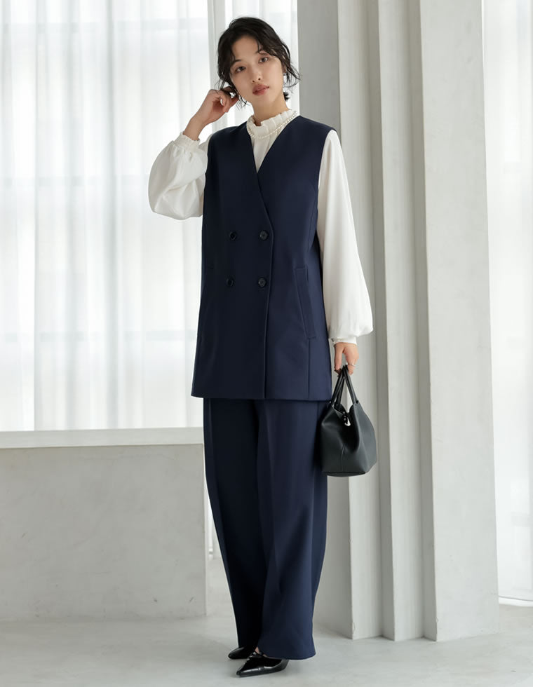 ベスト×パンツのセットアップは、きちんと感がありながらも華やかに見せてくれる優秀アイテム。 ヒップ周りまで隠れる長め丈のベストは、自然と体型カバーも叶えてくれます。 インナーには、首元にデザインのあるタイ付きブラウスやハイネックトップスを合わせるのがおすすめ。 定番のセットアップスタイルも、ベストを取り入れることで女性らしさのある着こなしにアップデート!