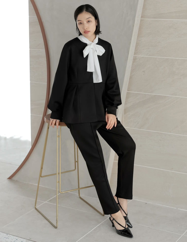 パンツセットアップは、動きやすさときちんと感を兼ね備えた、近年では特に人気のセレモニーコーデ。 タック入りのきちんと感のあるテーパードパンツなので、華やかさはもちろんのことすっきりとした美脚シルエットが叶います。 入学式・卒業式などの特別なシーンだけでなく、オフィスカジュアルやちょっとしたお出かけにもぴったりのコーディネートです。