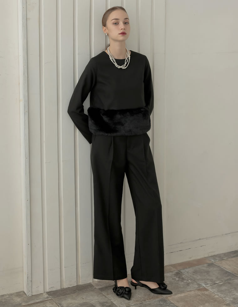オールブラックの着こなしは、セレモニーシーンでは敬遠されることもありますが、ほんの少しのファーディテールなら程よい華やかさで着映えも◎ パーティーシーンや特別な日のお出かけにもぴったりのアイテムです。