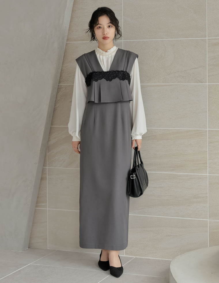 今季注目のビスチェ付きワンピースは、1枚でスタイリングが決まる優秀アイテム。 ビスチェの切り替えが自然と視線を上に集め、スタイルアップ効果も。 配色のレースデザインもポイントに。 ホワイト、ブラック、グレーのカラーでまとめつつ、素材やディテールに変化をつけることで、華やかな着こなしが叶います。 インナー次第でカジュアルにもきれいめにも着回せるのもポイントです。