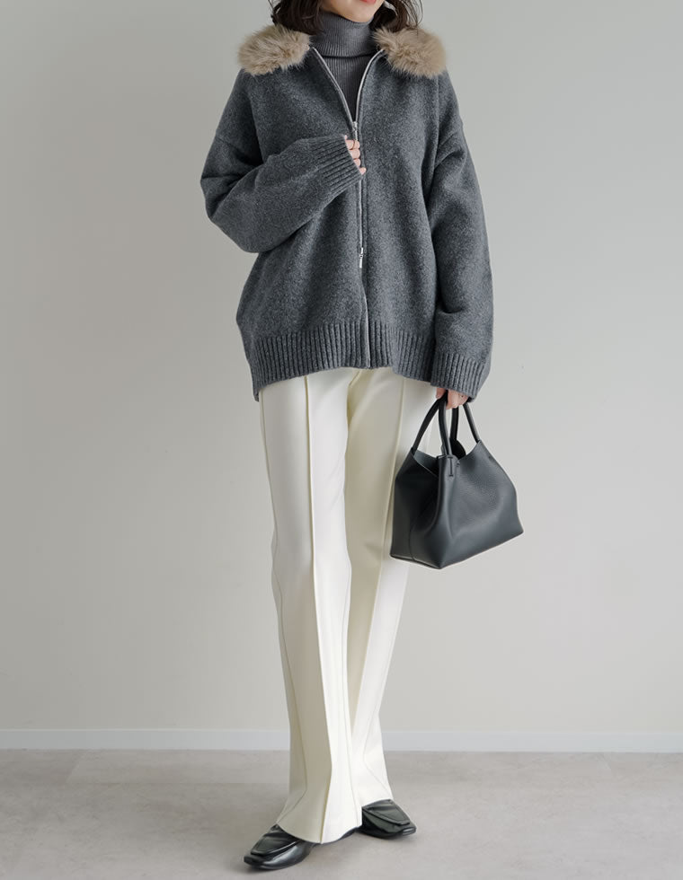 ふんわりと起毛感のある素材やファーは、コーディネートに取り入れるだけで華やぐ大人にうれしいアイテム。 ホワイトボトムで、冬らしい洒落感を楽しんで。 襟のファーは取り外しもできるので、真冬にはもちろん寒さの続く春先までロングシーズン活躍します。
