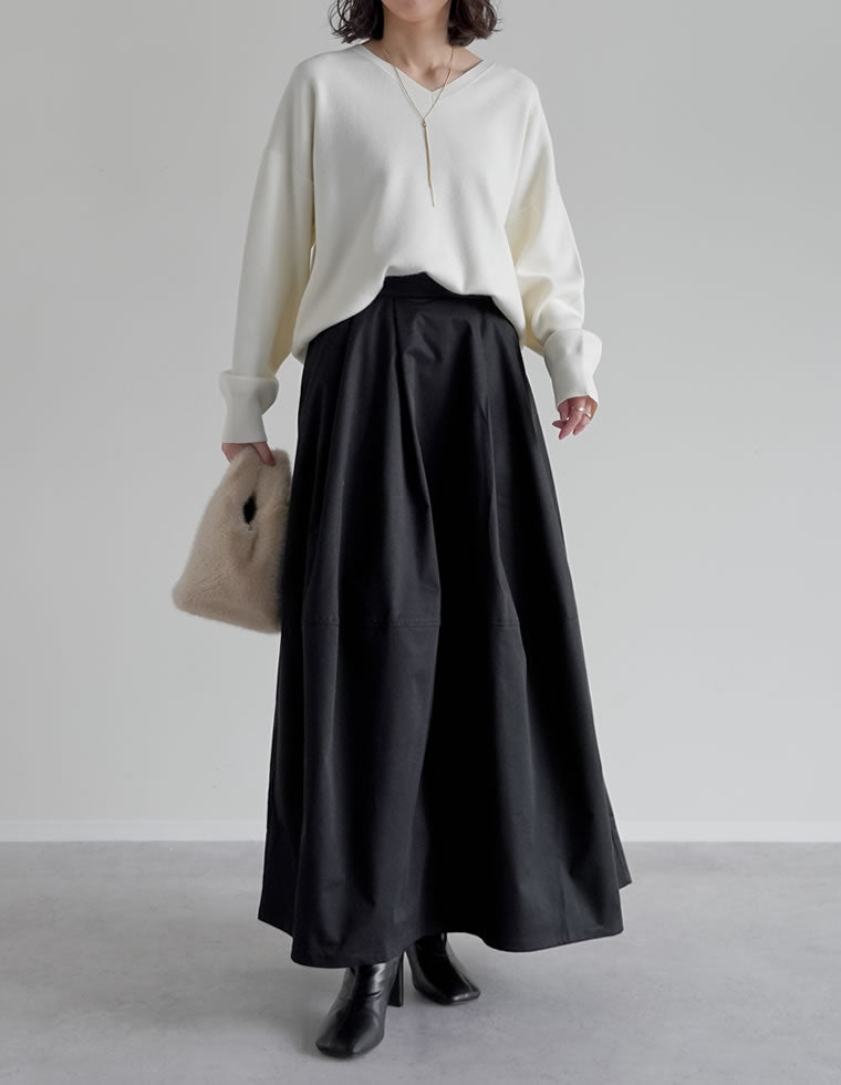 パンツやスカートのバルーンシルエットは、定番モノトーンに新鮮さを与えてくれる今季のトレンド。 ボリュームのあるシルエットでも、モノトーンなら取り入れやすく、きれいめなスタイリングにも馴染みます。 トップスをインすることで、自然とスタイルアップも。 白×黒の定番の組み合わせだからこそ、シルエットや素材で魅せるのが◎