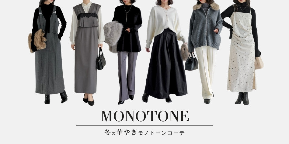 モノトーンはシンプルで万能な分、地味になりすぎないよう「素材感」「シルエット」「ディテール」で差をつけるのがポイント。 例えば、起毛感のあるニットや、タイ付きのトップス、暖かみのある素材を選ぶことで冬らしい表情に。 Iラインやバルーンシルエットなど、旬のシルエットで遊ぶとおしゃれ感もぐっとアップ。 小物でシルバーやパールを取り入れると、洗練された華やぎが生まれます。