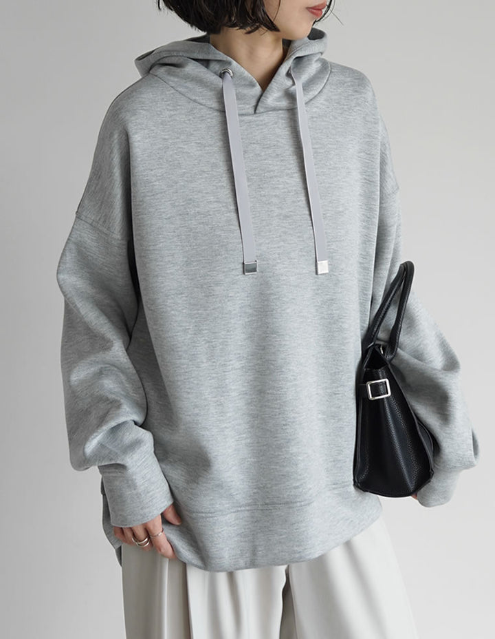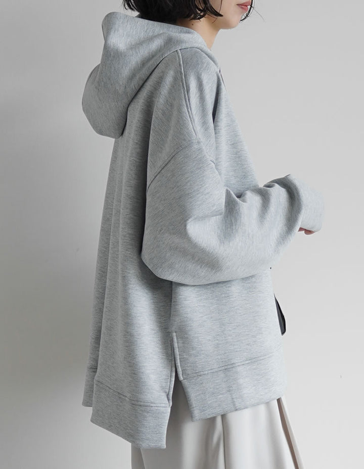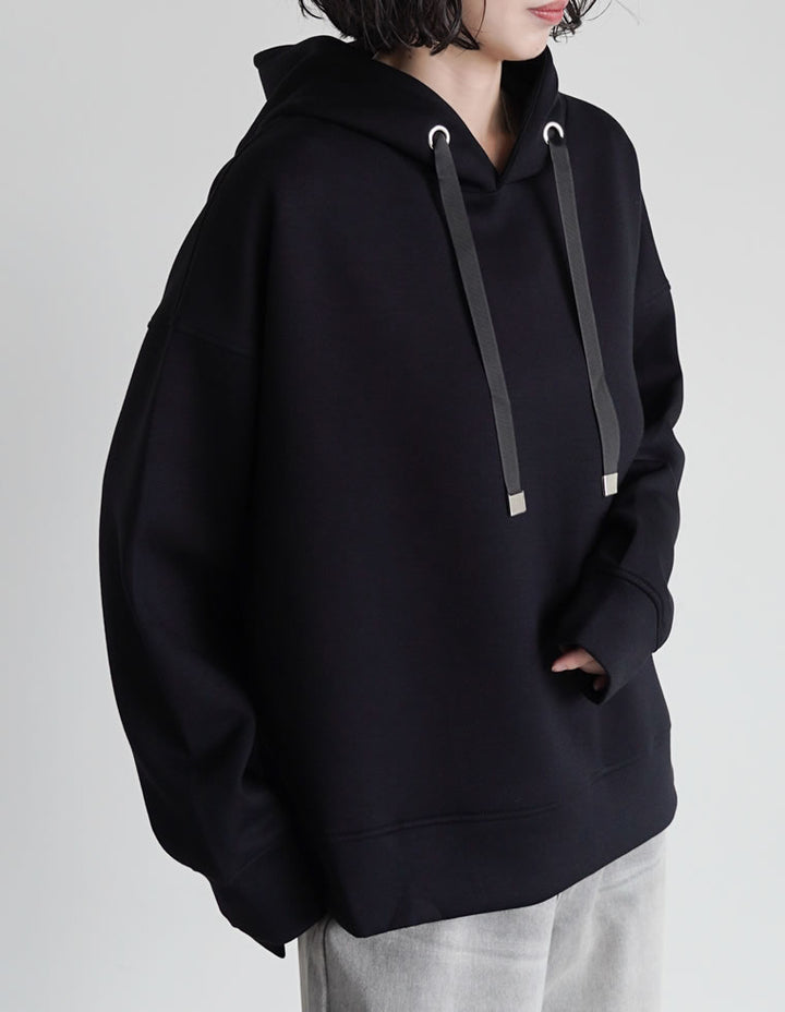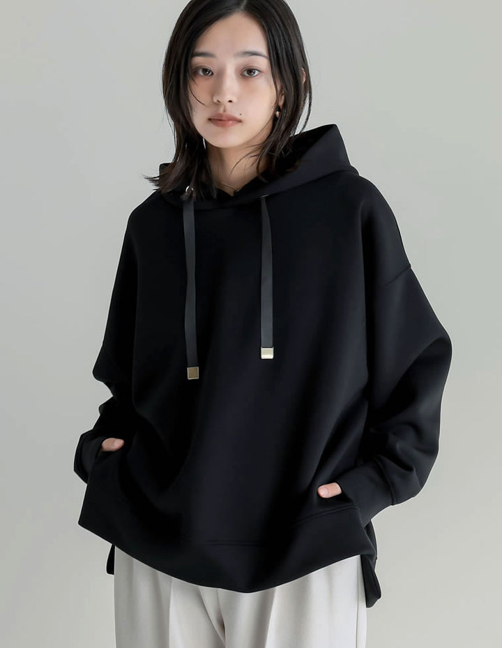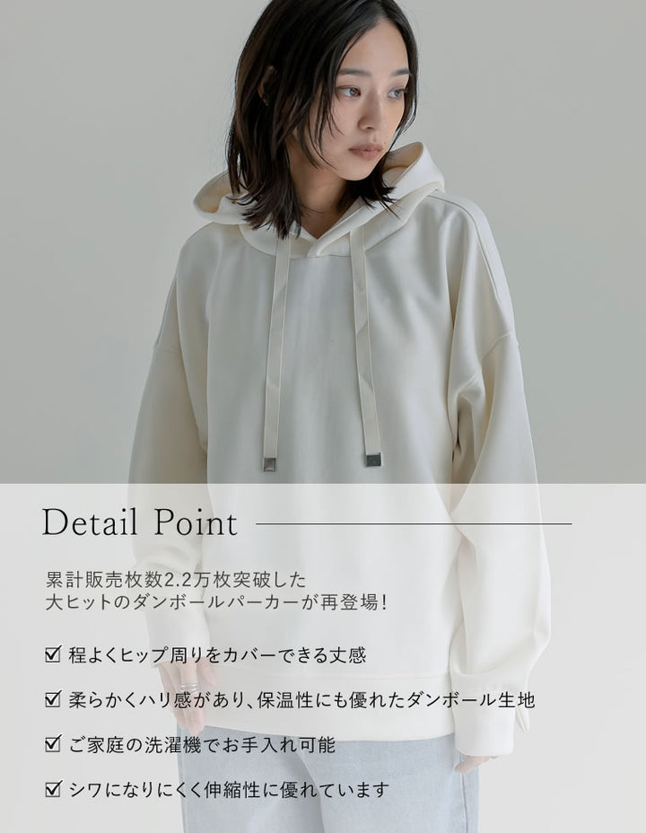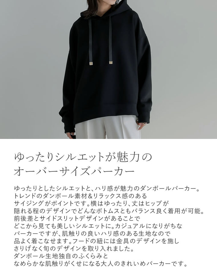 ▼デザインゆったりとしたシルエットとハリ感が魅力のダンボールパーカー。トレンドのダンボール素材&リラックス感のあるサイジングがポイントです。横はゆったり、丈はヒップが隠れるほどのデザインで、どんなボトムスともバランス良く着用が可能。前後差とサイドスリットデザインがあることで、どこから見ても美しいシルエットに。カジュアルになりがちなパーカーですが、肌触りの良いハリ感のある生地なので、品よく着こなせます。フードの紐には金具のデザインを施し、さりげなく旬の要素を取り入れました。ダンボール生地独自のふくらみとなめらかな肌触りがクセになる、大人のきれいめパーカーです。▼素材・着用感生地が「ダンボール」に似た構造になったダンボール生地。ハリがありながらも、柔らかくしなやかな質感が特徴。表面糸と裏面糸を中糸でつなげて作る生地のことを指します。段ボールの構造によく似ているため、その名前が付きました。中糸の間に空気を溜めることができるため、保温性に優れ、軽い着心地が特徴です。