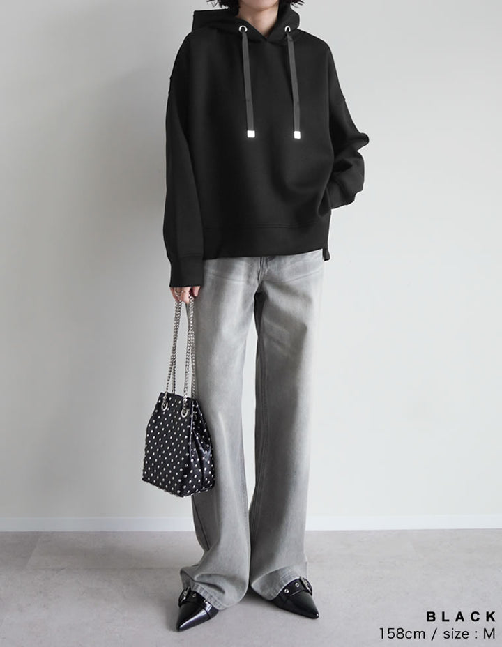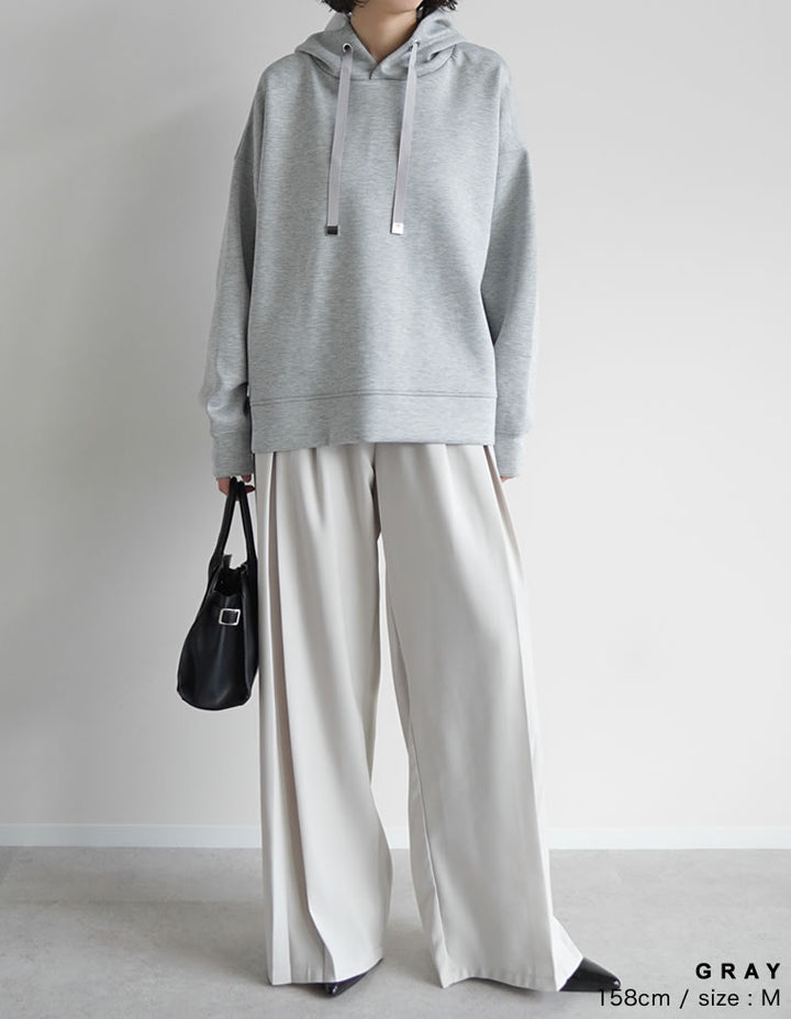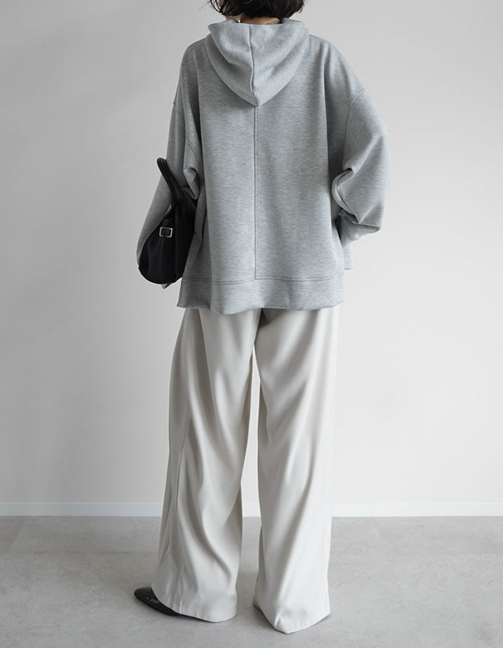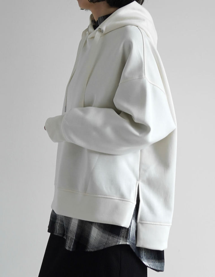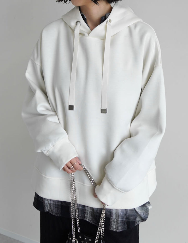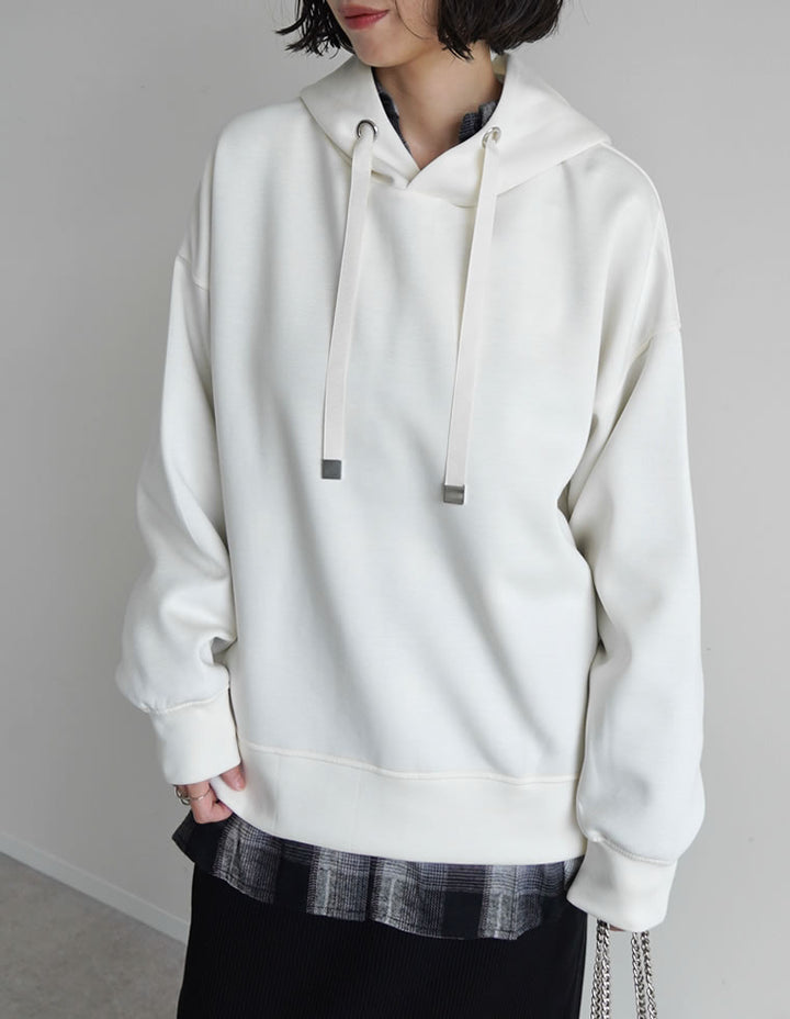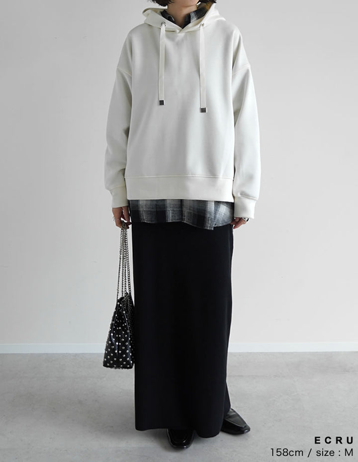 ▼デザインゆったりとしたシルエットとハリ感が魅力のダンボールパーカー。トレンドのダンボール素材&リラックス感のあるサイジングがポイントです。横はゆったり、丈はヒップが隠れるほどのデザインで、どんなボトムスともバランス良く着用が可能。前後差とサイドスリットデザインがあることで、どこから見ても美しいシルエットに。カジュアルになりがちなパーカーですが、肌触りの良いハリ感のある生地なので、品よく着こなせます。フードの紐には金具のデザインを施し、さりげなく旬の要素を取り入れました。ダンボール生地独自のふくらみとなめらかな肌触りがクセになる、大人のきれいめパーカーです。▼素材・着用感生地が「ダンボール」に似た構造になったダンボール生地。ハリがありながらも、柔らかくしなやかな質感が特徴。表面糸と裏面糸を中糸でつなげて作る生地のことを指します。段ボールの構造によく似ているため、その名前が付きました。中糸の間に空気を溜めることができるため、保温性に優れ、軽い着心地が特徴です。