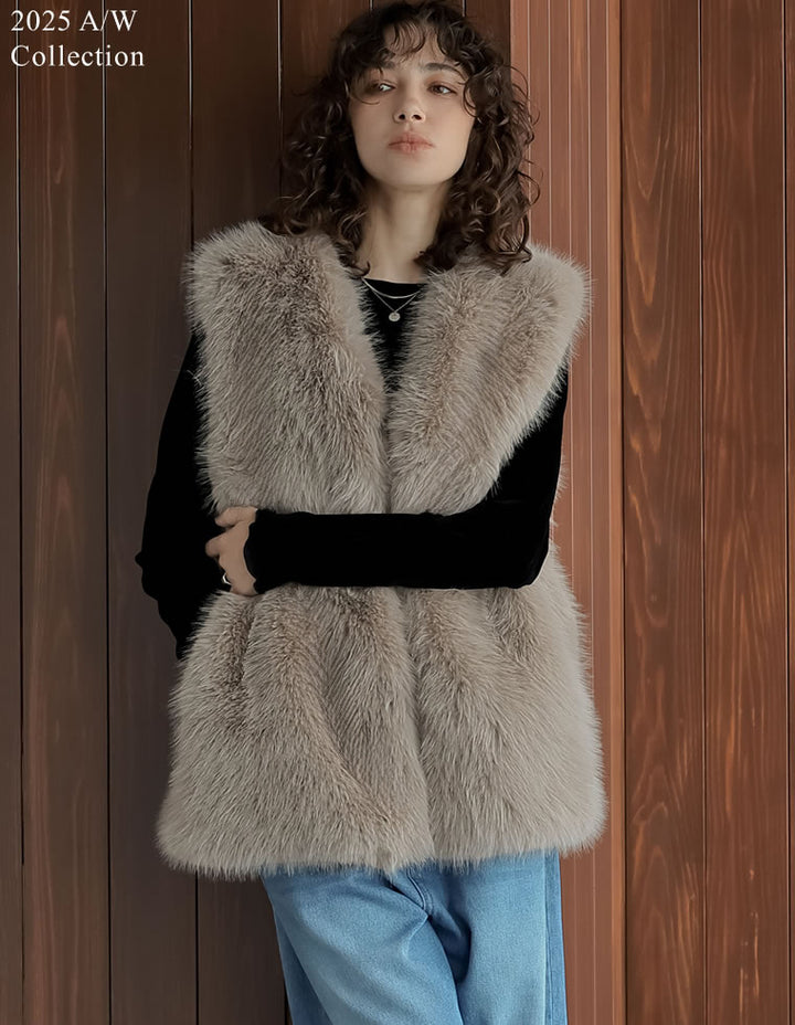 ふんわりとした毛足感と軽やかな着心地が魅力のフェイクファーベスト。ノーカラーデザインで首元はすっきりと仕上げ、どんなトップスともバランス良くレイヤードできます。フロントはあえて装飾を抑えたミニマルな仕立てで、羽織るだけで洗練されたモードな印象に。内側のホックを留めれば、すっきりとまとまった着こなしも楽しめます。ヒップにかかる絶妙な丈感は、さりげなく体型をカバーしつつスタイルアップも叶えてくれるポイント。ワンピースに重ねてドレスライクに、パンツ合わせでデイリーに、さらには特別なシーンにも映える。リアルファーさながらのリュクスな表情で、今年の着映えアウターとしてワードローブに迎えたい一着です。