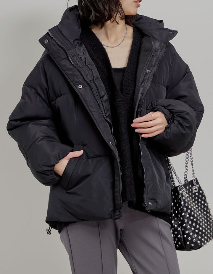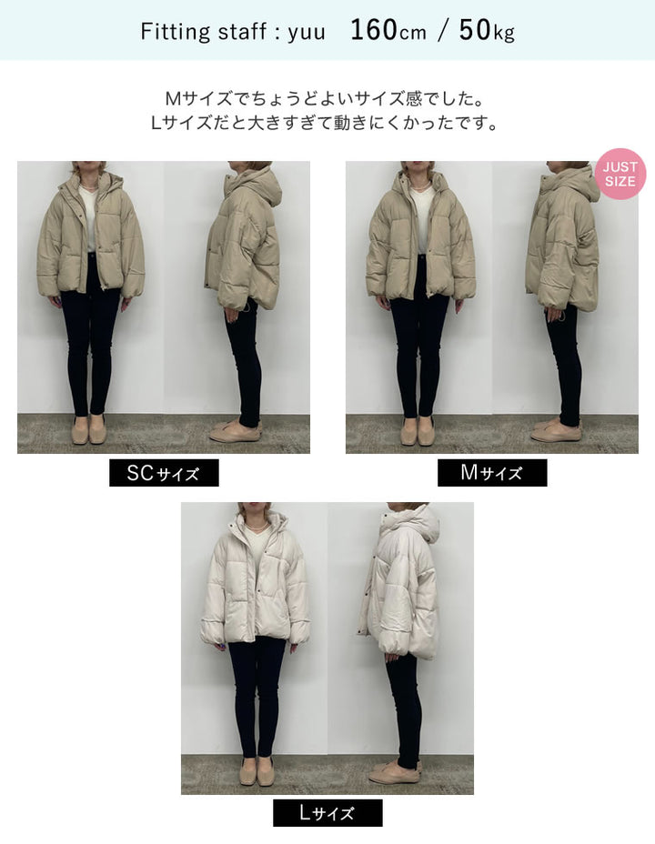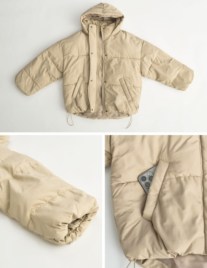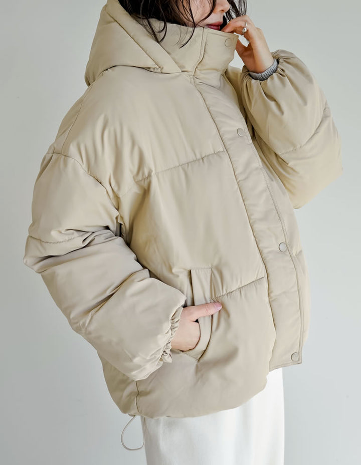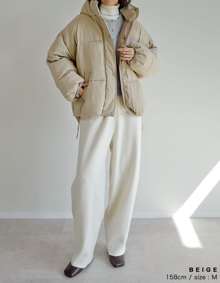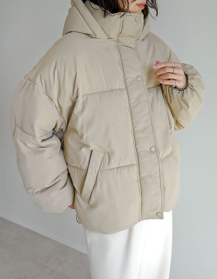 トレンドの短丈シルエットに、スタンドカラーとフードを組み合わせたフェイクダウンジャケット。裾のドロストでシルエットを調整でき、ふんわり丸みのあるコクーンフォルムに仕上げました。切り替えステッチを施すことで、本格的なダウンのような立体感を演出。たっぷりと中綿を入れた防寒性の高さに加え、軽くて疲れにくい着心地も魅力です。袖口はゴム仕様で風を通しにくく、フロントはジップ+ボタンの2重仕様でしっかり防寒。短めの丈感がスタイルアップを叶え、きれいめからカジュアルまで幅広く活躍します。