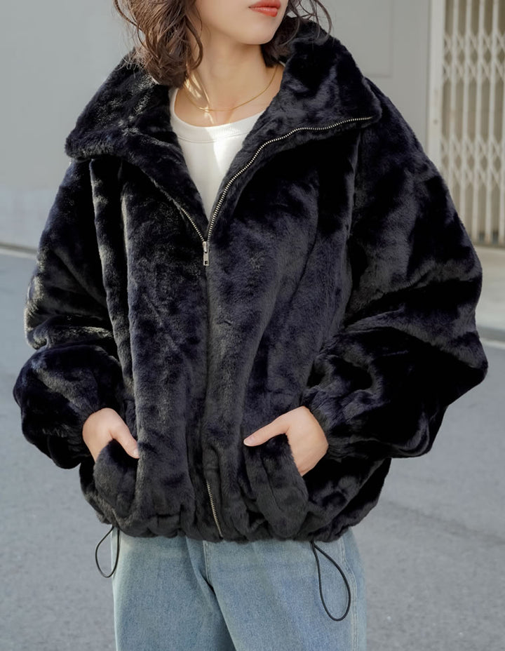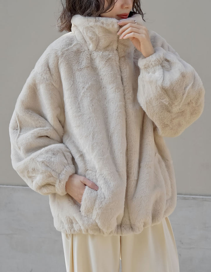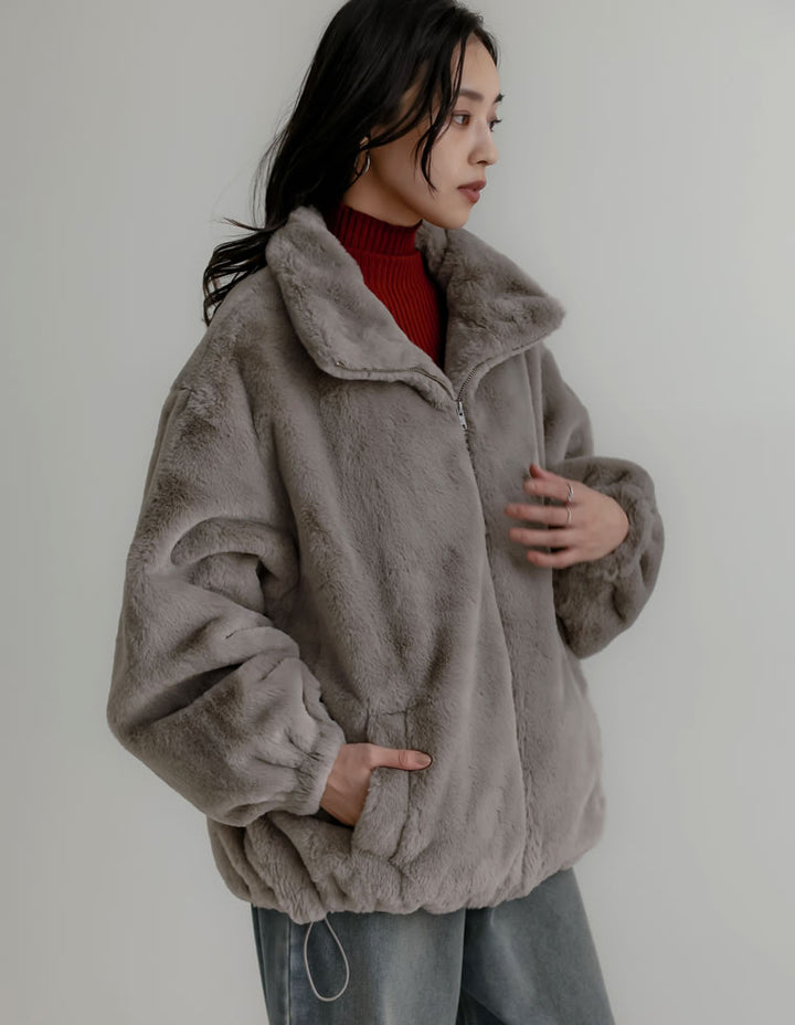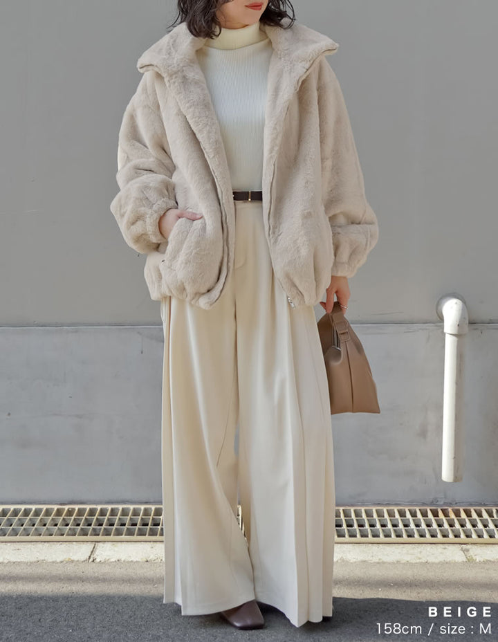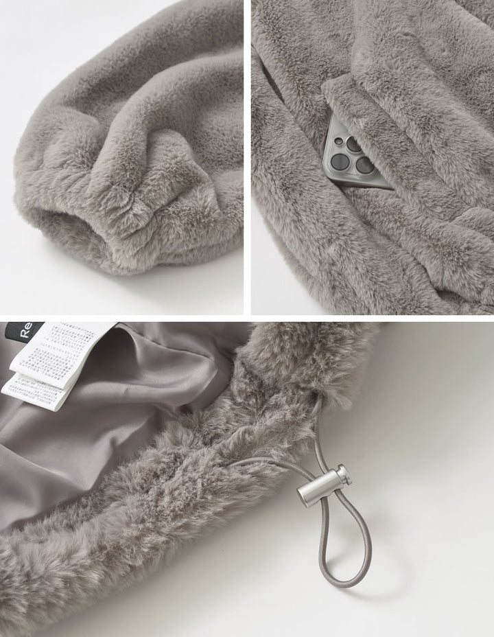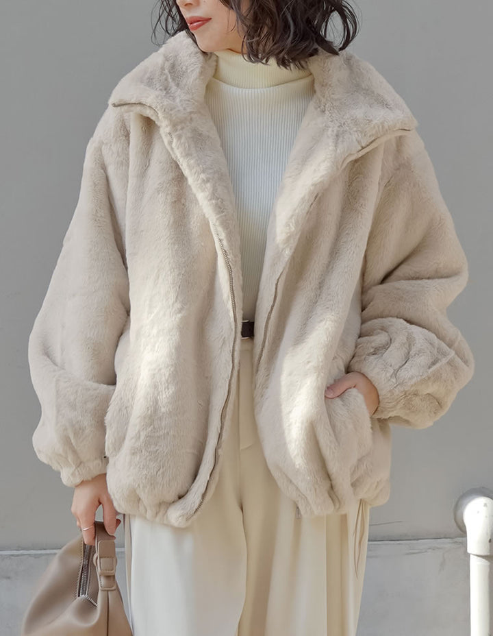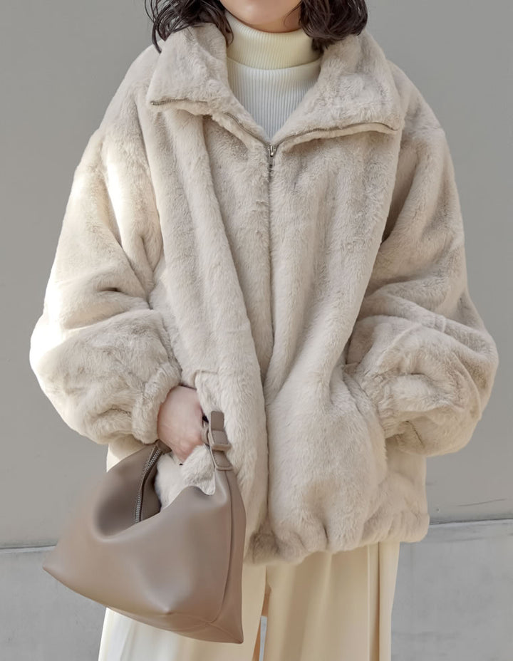ふんわりと滑らかな質感で、肌当たりの良いフェイクファーコート。ハイネックデザインなので、ファスナーを閉めると首元まで暖かい1着です。丸みのあるボリュームスリーブがフェミニンな印象をプラス。裾部分のドロストを絞れば、すっきりとしたシルエットもお楽しみいただけます。ふんわりとボリューミーながら軽く柔らかな素材で、着ぶくれしないのも嬉しいポイント。ミドル丈で腰回りまでしっかり暖かく、ワンピースやスカートともバランス良く着こなせます。シーズンムードを高める、今季注目のフェイクファーアウターです。