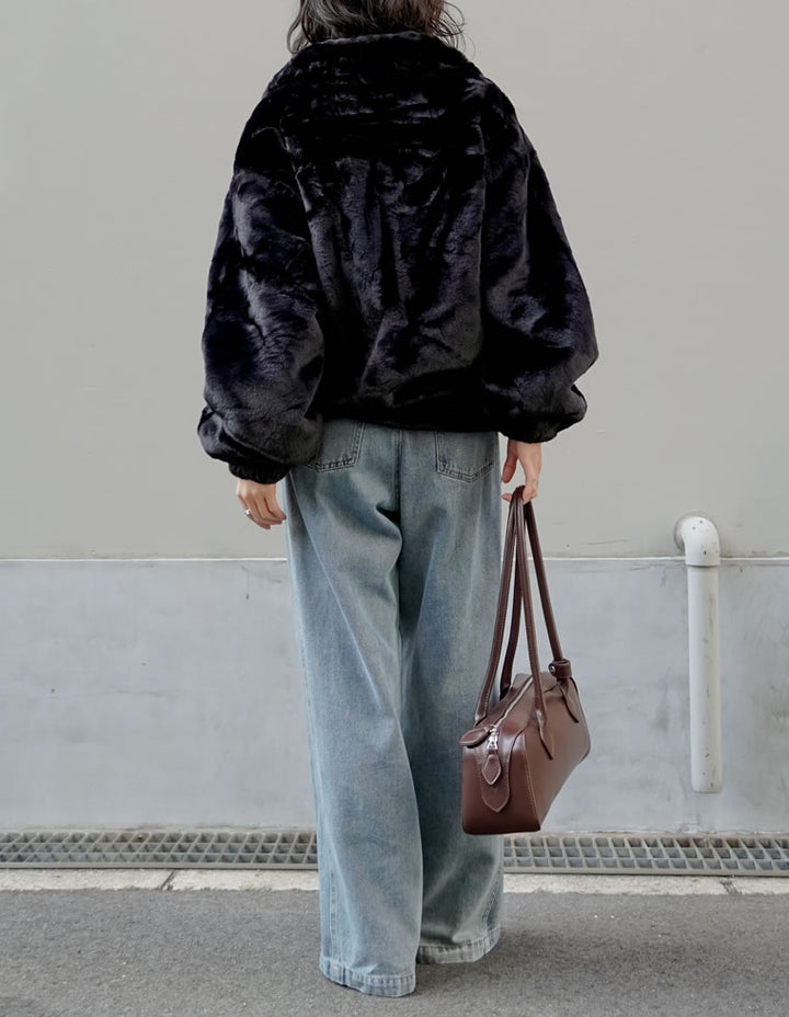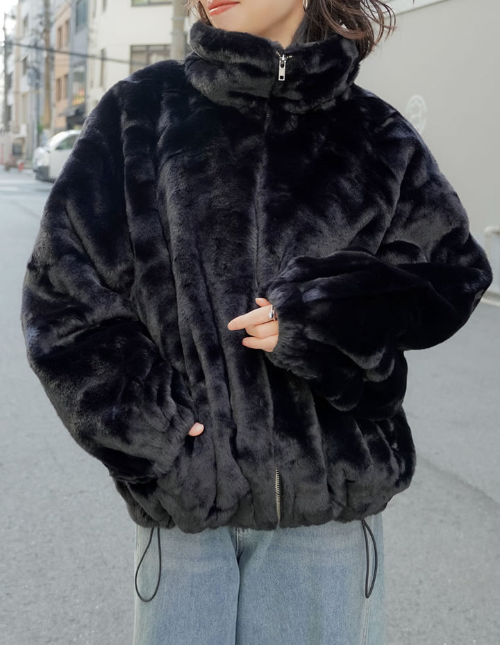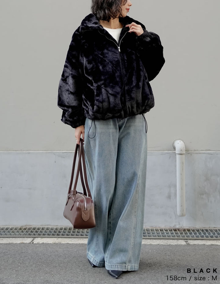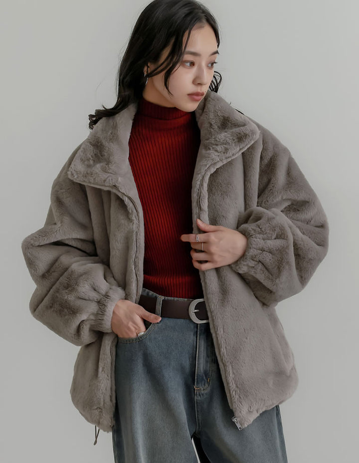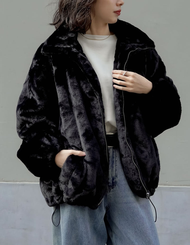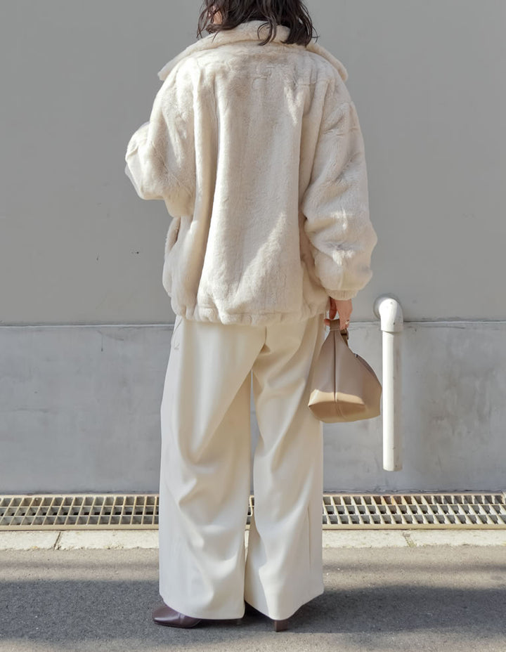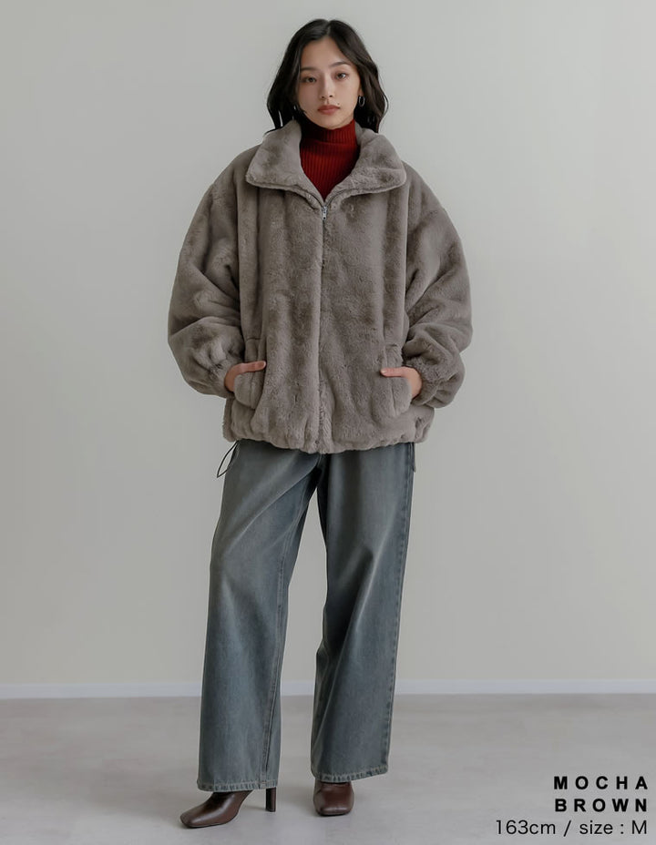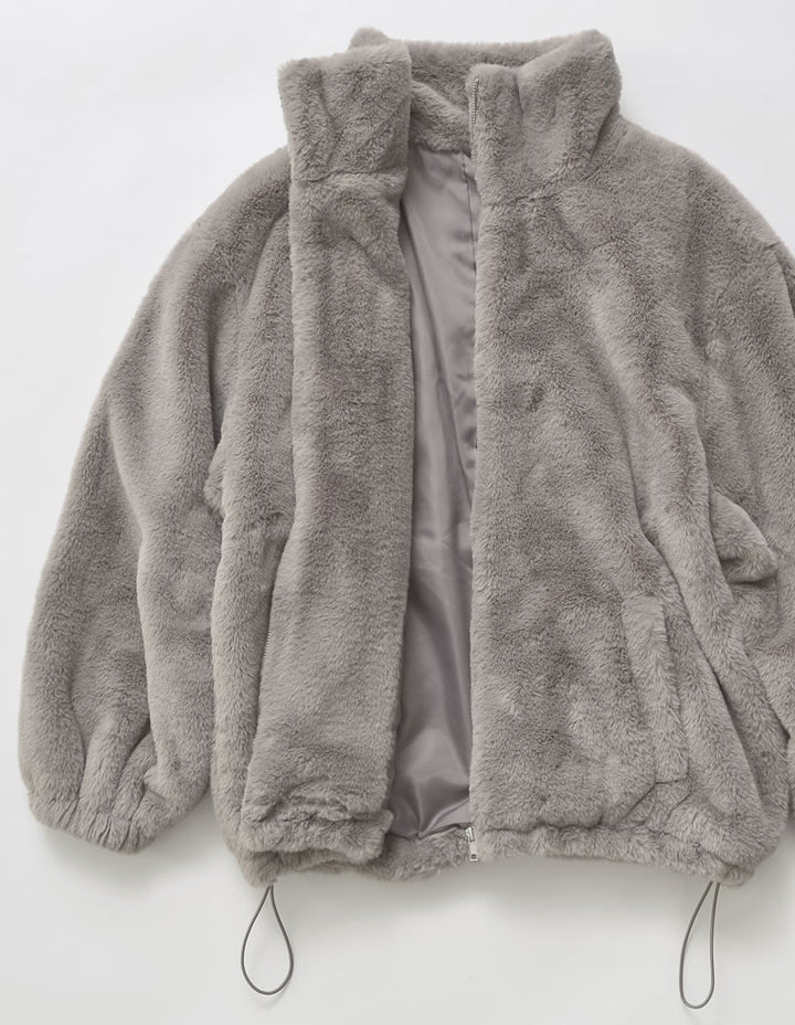 ふんわりと滑らかな質感で、肌当たりの良いフェイクファーコート。ハイネックデザインなので、ファスナーを閉めると首元まで暖かい1着です。丸みのあるボリュームスリーブがフェミニンな印象をプラス。裾部分のドロストを絞れば、すっきりとしたシルエットもお楽しみいただけます。ふんわりとボリューミーながら軽く柔らかな素材で、着ぶくれしないのも嬉しいポイント。ミドル丈で腰回りまでしっかり暖かく、ワンピースやスカートともバランス良く着こなせます。シーズンムードを高める、今季注目のフェイクファーアウターです。