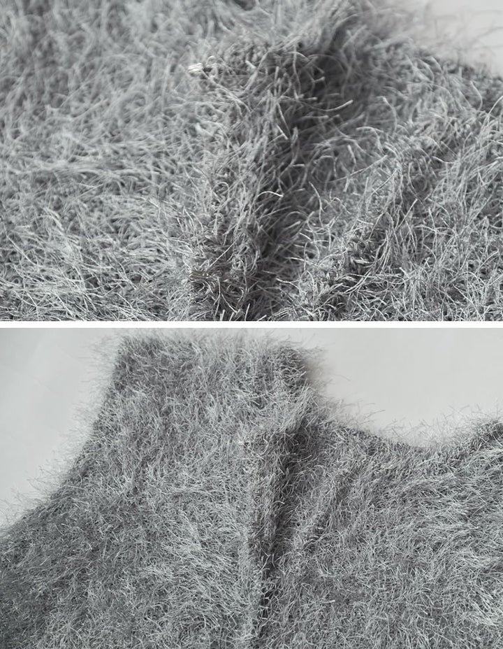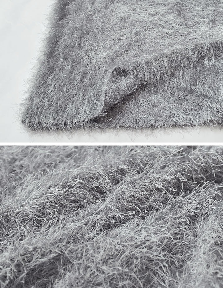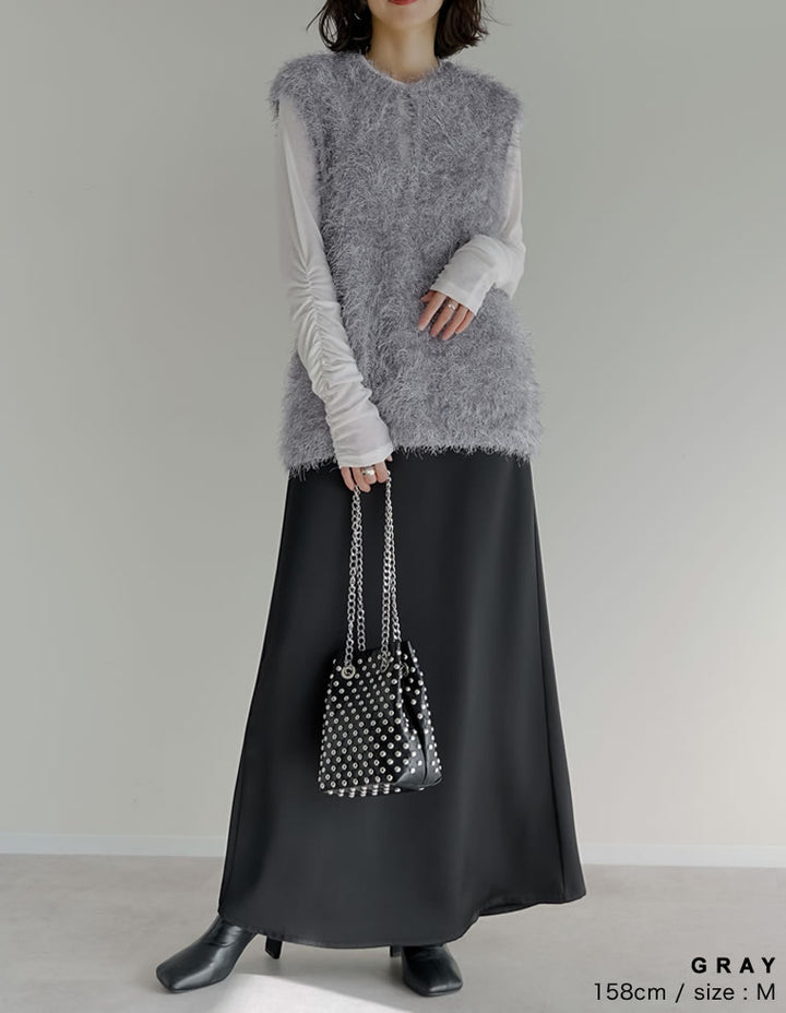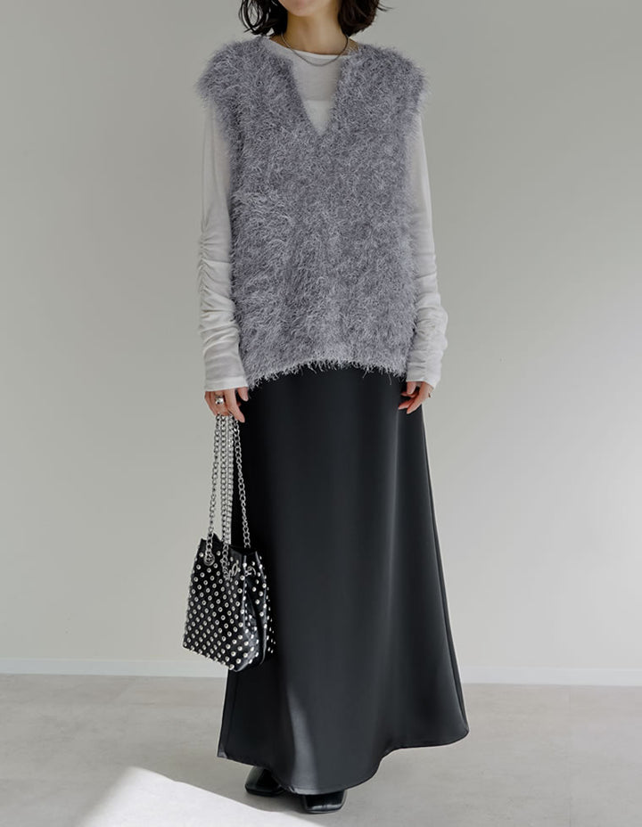 毛足の長いリッチなルックスのフェザーニット素材で、フェミニンな印象に。
