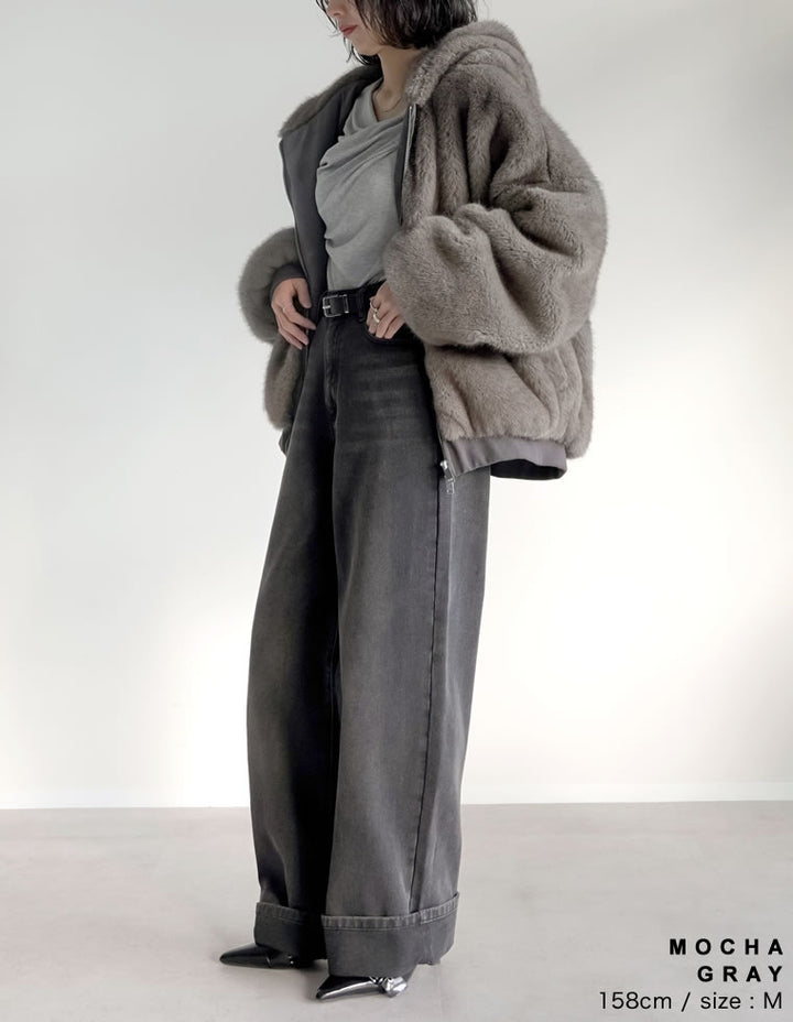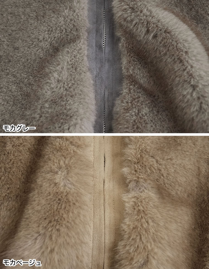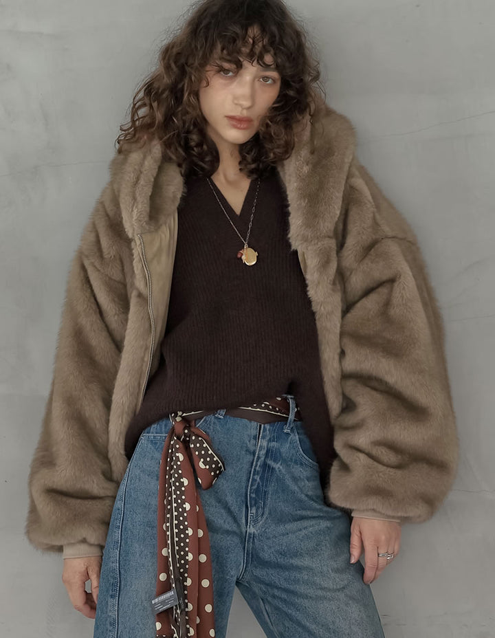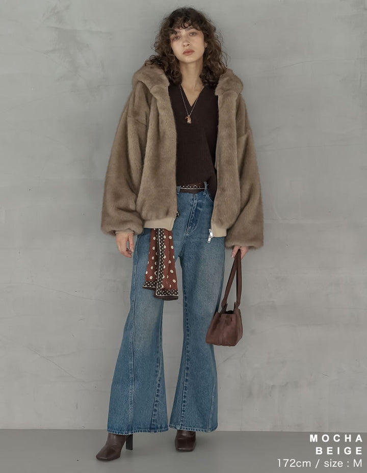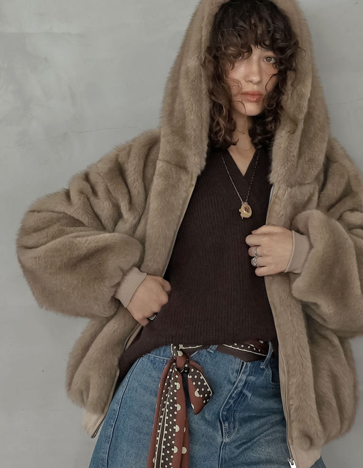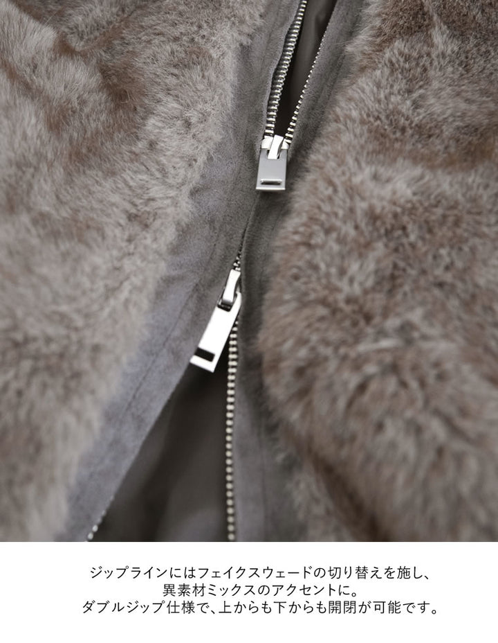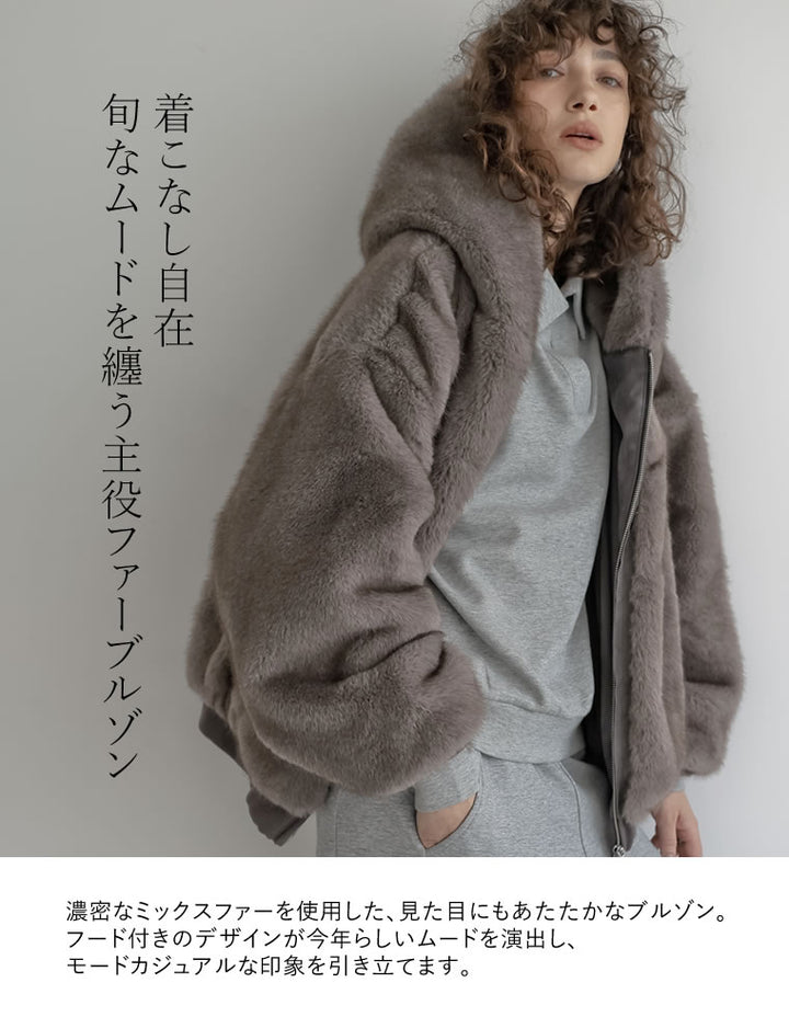 濃密なミックスファーを使用した、見た目にもあたたかなフーディーブルゾン。フード付きのデザインが今年らしいムードを演出し、モードカジュアルな印象を引き立てます。袖口と裾をリブで切り替えることで、全体を程よく引き締めつつ、カジュアルさをプラス。トレンド感と機能性を兼ね備えたダブルジップ仕様で、上からも下からも開閉が可能です。さらにジップラインにはフェイクスウェードの切り替えを施し、異素材ミックスのアクセントに。裾を開けてインナーのニットやシャツをのぞかせれば、抜け感のあるスタイリングが完成します。見た目のボリューム感とは裏腹に軽やかな着心地で、真冬まで暖かく快適に着用できる1着です。