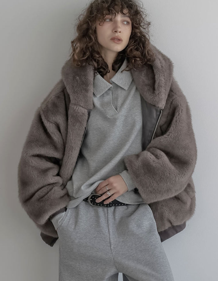 リッチな印象のファー素材ながら、リブ使いで程よくカジュアルダウンされているため、幅広いスタイルにマッチ。ナローシルエットのパンツやスカートを合わせて、オーバーサイズのシルエットを際立たせる着こなしがおすすめです。ジップを開けてベルトやウエスト部分を覗かせれば、こなれ感のあるトレンドスタイルに。フェミニンなワンピースやロングスカートに羽織ったミックススタイルも、今季らしいバランスで楽しめます。