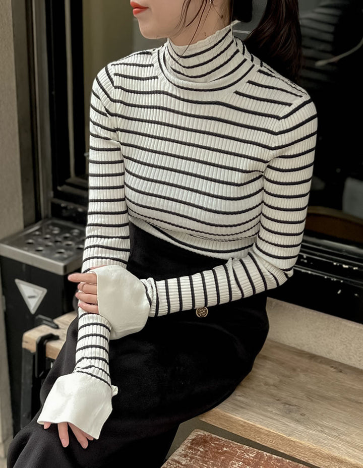 伸縮性のあるニットで、楽に着用できました。ハイネックデザインですが、窮屈感はありません。