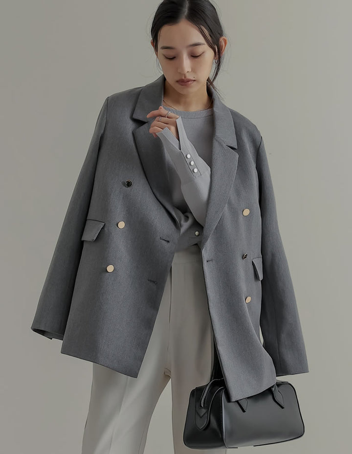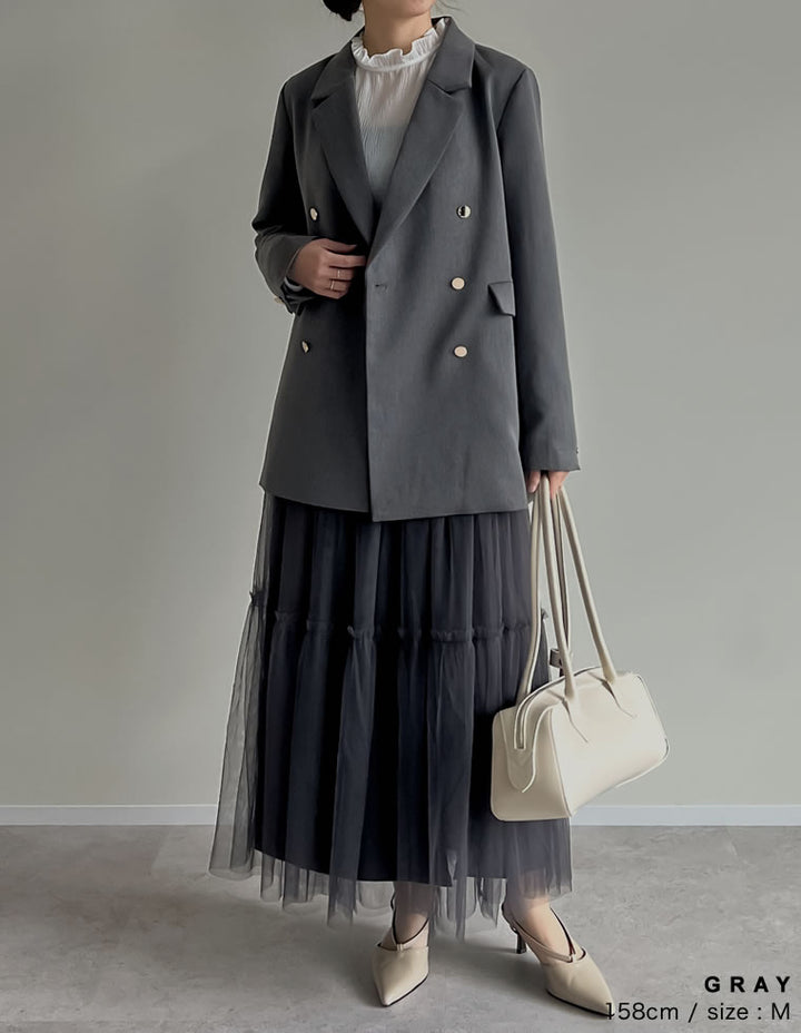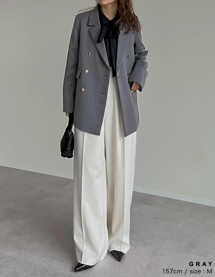 オンオフ問わず取り入れられる、金ボタンテーラードジャケット。