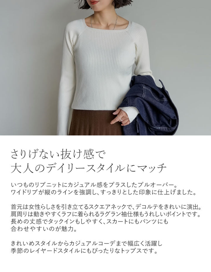 ▼デザインいつものリブニットにカジュアル感をプラスした、スクエアネックリブニットプルオーバー。ワイドリブが縦のラインを強調し、すっきりとした印象に仕上げました。首元は女性らしさを引き立てるスクエアネックで、デコルテをきれいに演出。肩周りは動きやすくラフに着られるラグラン袖仕様もうれしいポイントです。長めの丈感でタックインもしやすく、スカートにもパンツにも合わせやすいのが魅力。きれいめスタイルからカジュアルコーデまで幅広く活躍し、季節のレイヤードスタイルにもぴったりなトップスです。▼コーディネートトレンド感のあるサテンスカートに合わせると、きれいめなスタイルアップコーデが完成。スラックスパンツと合わせれば、オフィスカジュアルスタイルにもおすすめです。▼素材やわらかな肌当たりのリブニット素材