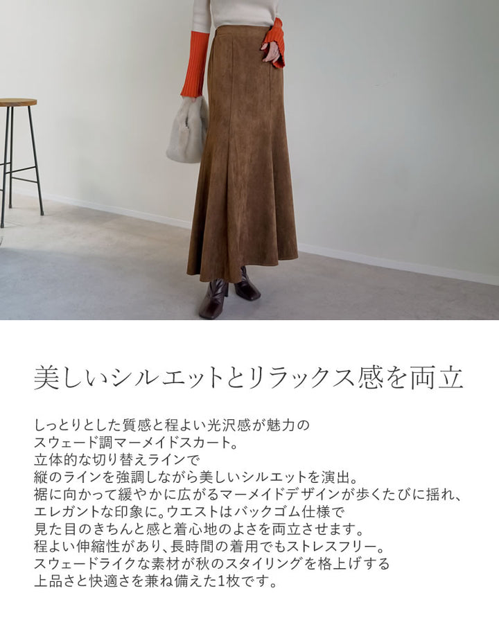 しっとりとした質感と程よい光沢感が魅力の、スウェード調マーメイドスカート。立体的な切り替えラインで、縦のラインを強調しながら美しいシルエットを演出。裾に向かって緩やかに広がるマーメイドデザインが、歩くたびに揺れ、エレガントな印象に。ウエストはバックゴム仕様で、見た目のきちんと感と着心地のよさを両立させます。程よい伸縮性があり、長時間の着用でもストレスフリー。スウェードライクな素材が秋のスタイリングを格上げする、上品さと快適さを兼ね備えた1枚です。