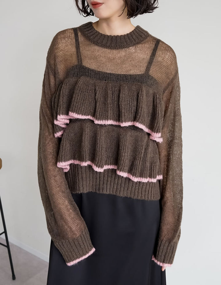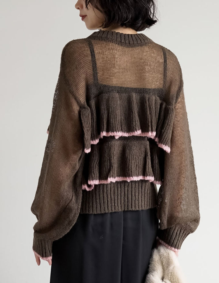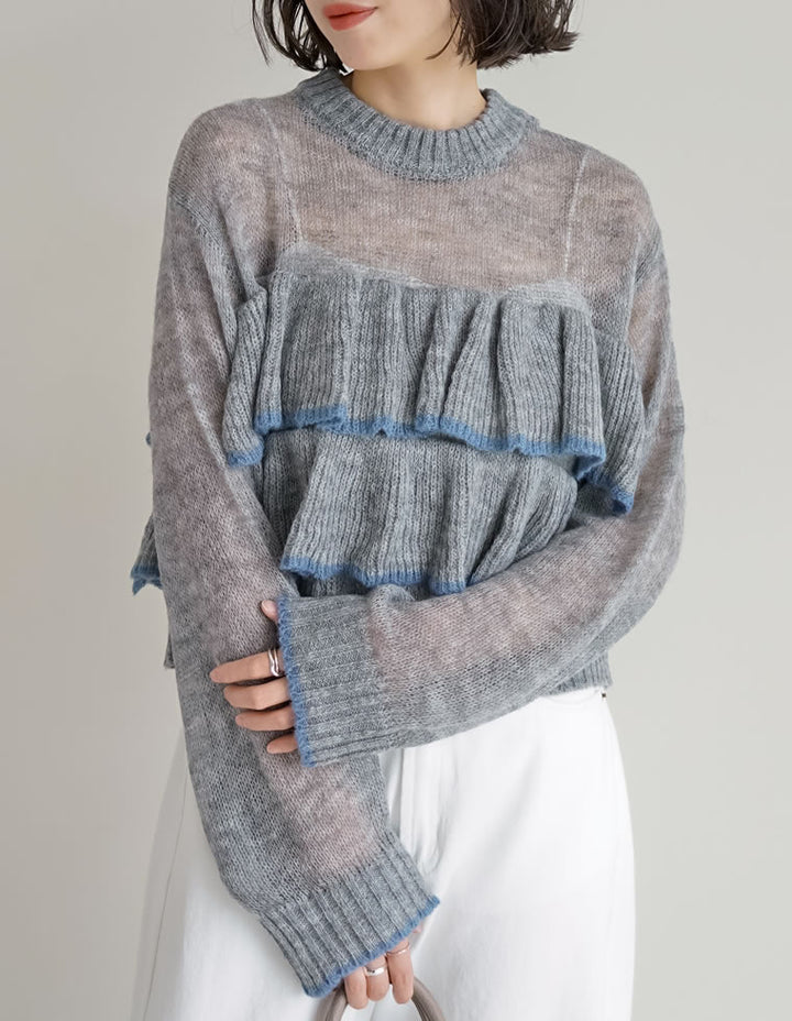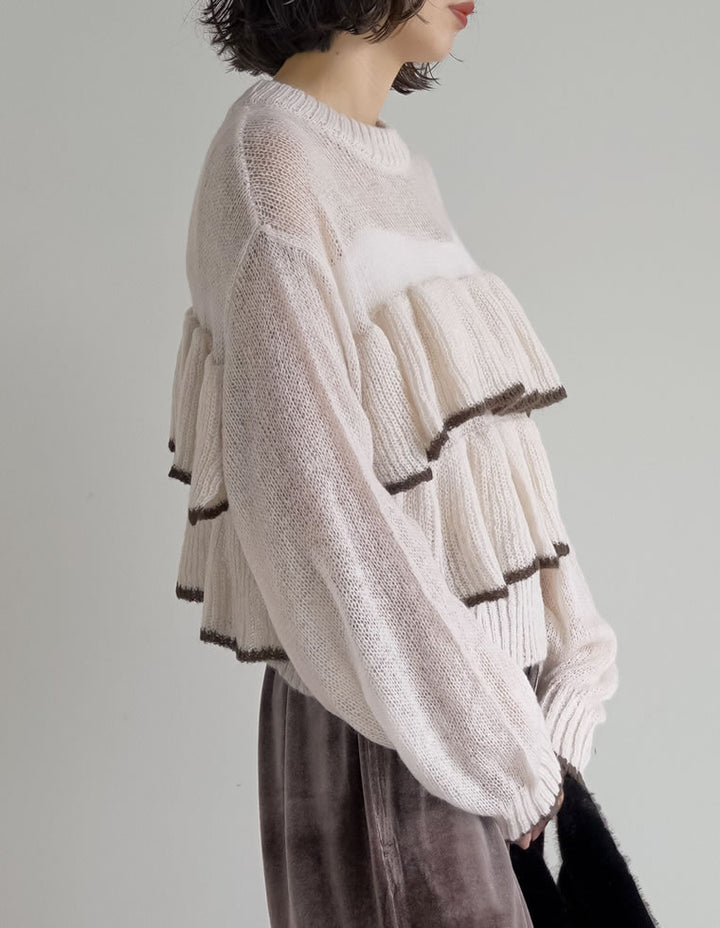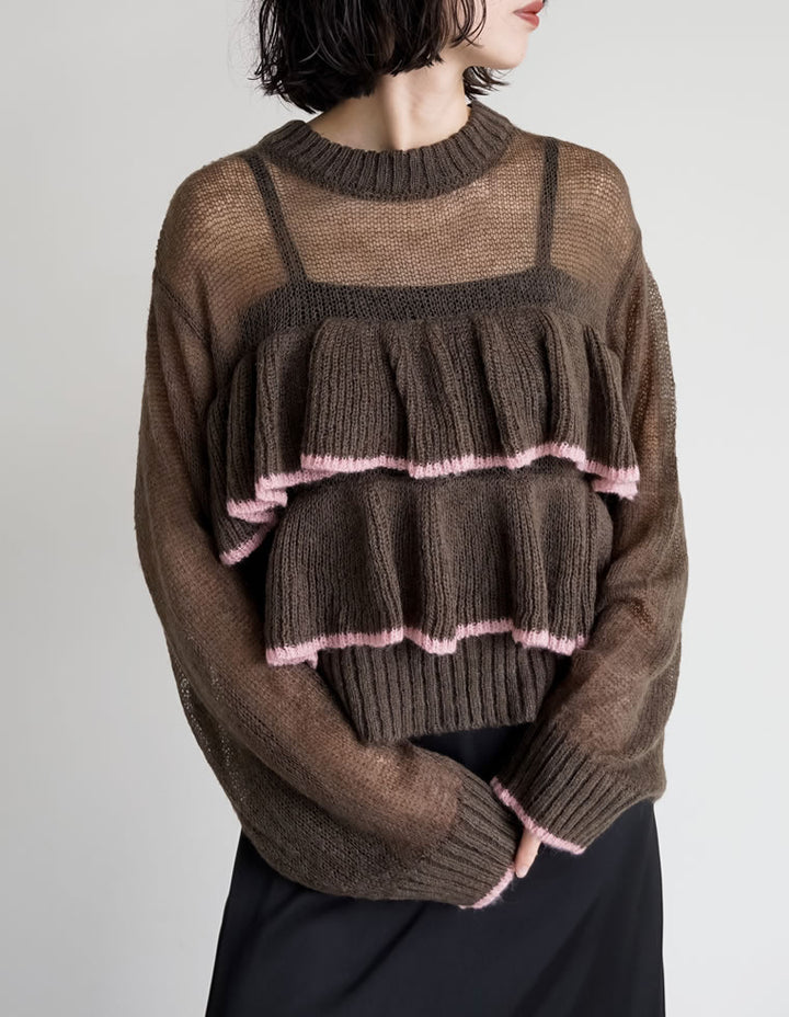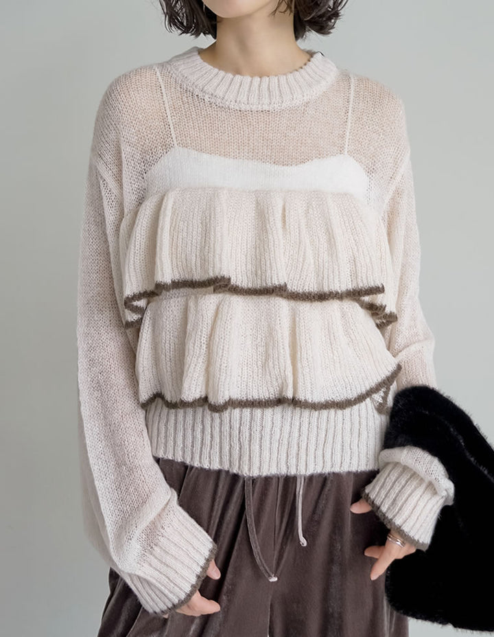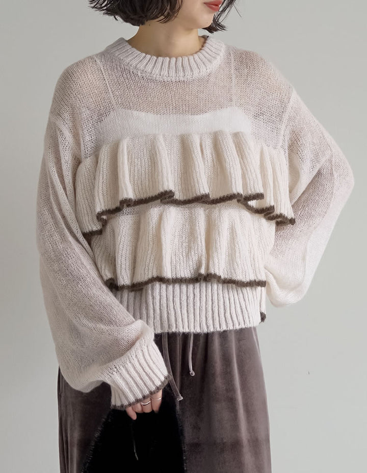 モヘアタッチのふんわりとした風合いが魅力の透かし編みニットトップス。裾と袖にあしらったフリルが揺れ、旬のコーディネートが完成します。縁に配したバイカラーデザインがアクセントとなり、フェミニンになりすぎず大人のモードな要素をプラス。透け感のある編地なので、キャミソールやTシャツなどインナーとのレイヤードも自在に楽しめます。ティアードフリルの立体感が、シンプルなボトムに合わせるだけで着映えするデザイン。シーズンライクなふんわり感と軽やかさを兼ね備え、これ1枚で旬のスタイリングを叶えるニットです。