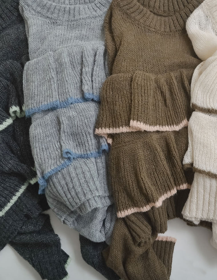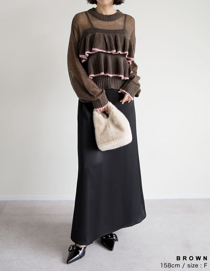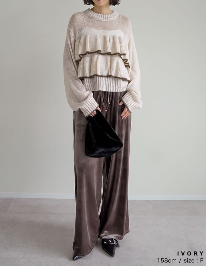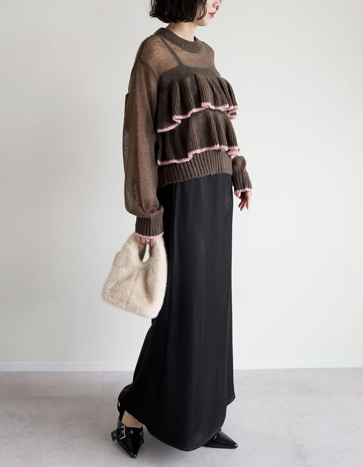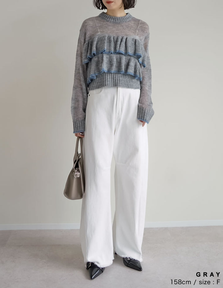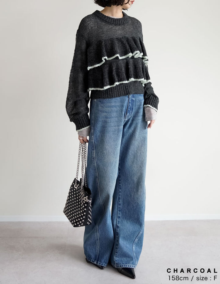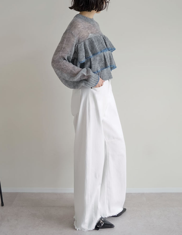 モヘアタッチのふんわりとした風合いが魅力の透かし編みニットトップス。裾と袖にあしらったフリルが揺れ、旬のコーディネートが完成します。縁に配したバイカラーデザインがアクセントとなり、フェミニンになりすぎず大人のモードな要素をプラス。透け感のある編地なので、キャミソールやTシャツなどインナーとのレイヤードも自在に楽しめます。ティアードフリルの立体感が、シンプルなボトムに合わせるだけで着映えするデザイン。シーズンライクなふんわり感と軽やかさを兼ね備え、これ1枚で旬のスタイリングを叶えるニットです。