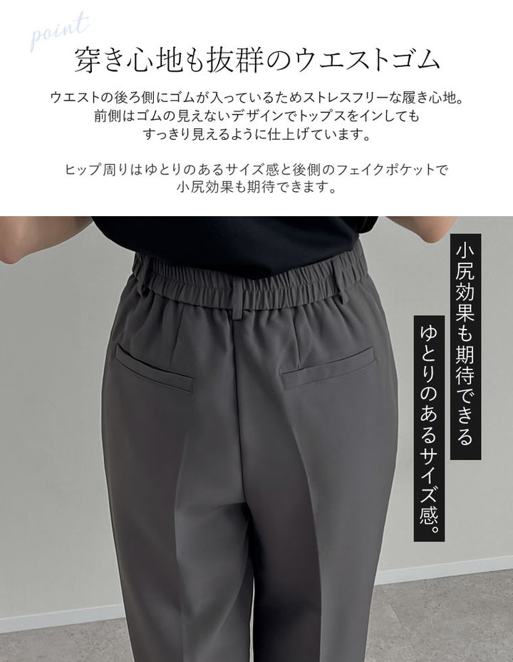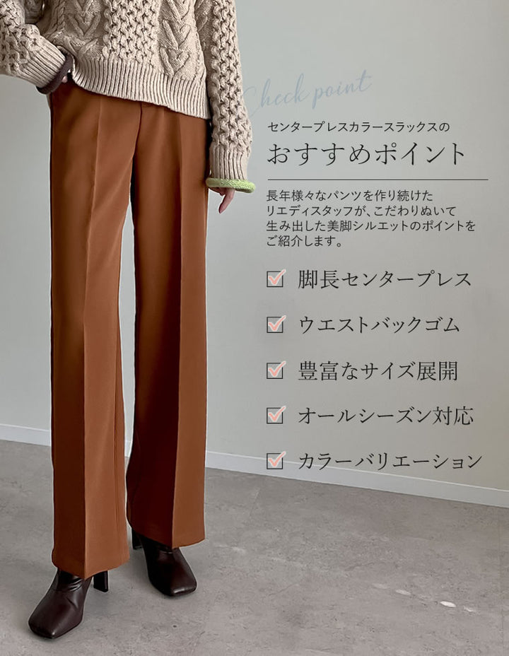 センタープレスデザインが脚をすっきりと見せ、ウエストはバックゴム仕様。