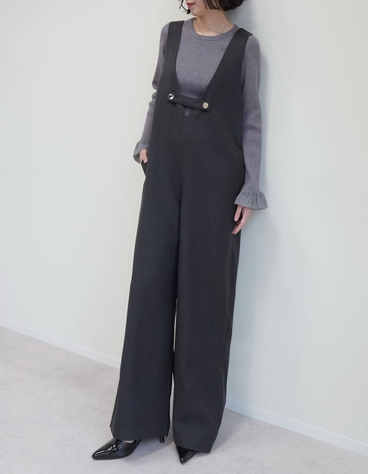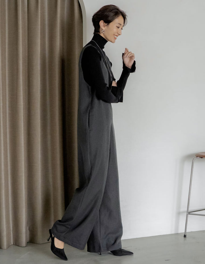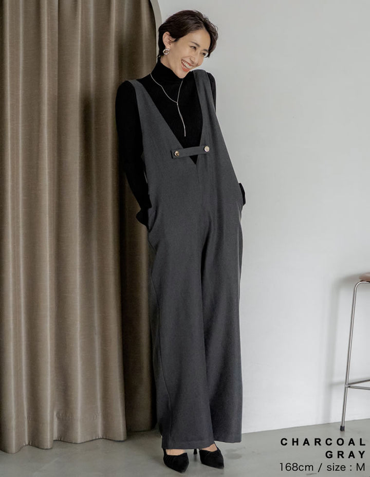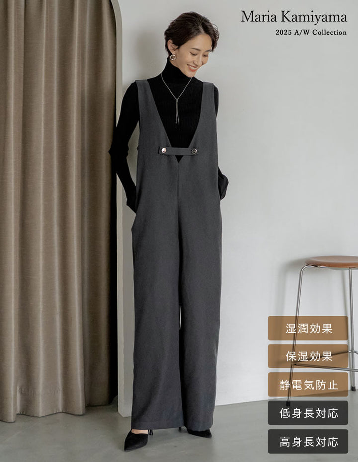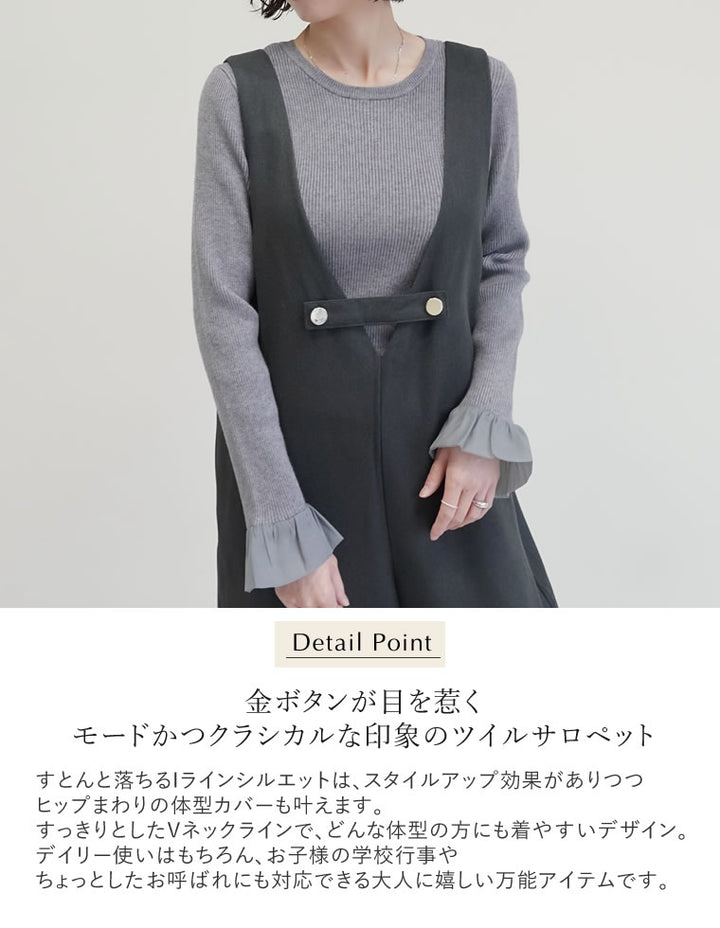 フロントの金ボタンが目を惹く、モードかつクラシカルな印象の微起毛ツイルサロペット。すとんと落ちるIラインシルエットは、スタイルアップ効果がありつつヒップまわりの体型カバーも叶えます。すっきりとしたVネックラインで、どんな体型の方にも着やすいデザインに仕上げました。インナーを変えるだけで印象が変わり、デイリー使いはもちろん、お子様の学校行事やちょっとしたお呼ばれシーンにも対応できる万能アイテムです。トレンド感と着心地の良さを兼ね備えた、大人に嬉しい1枚です。