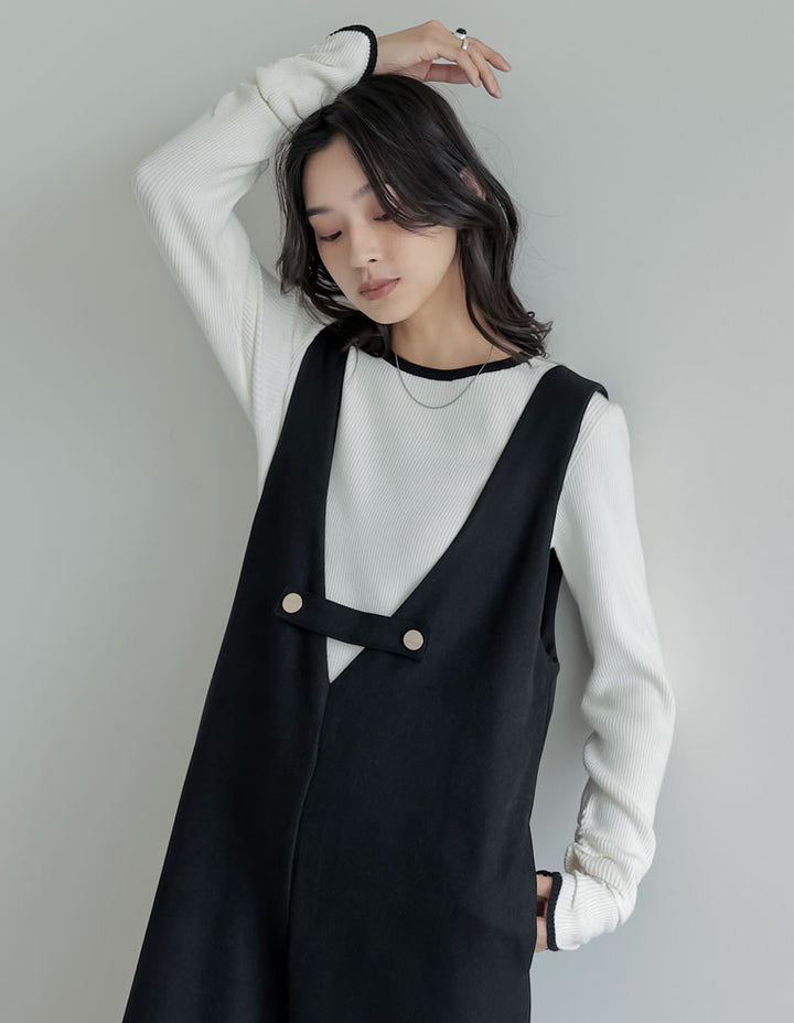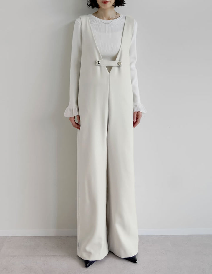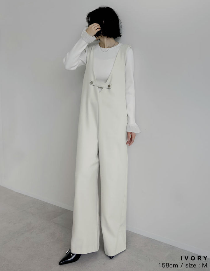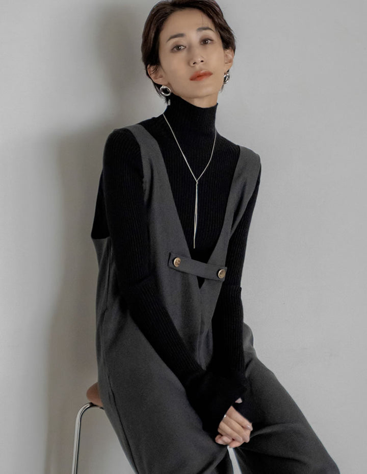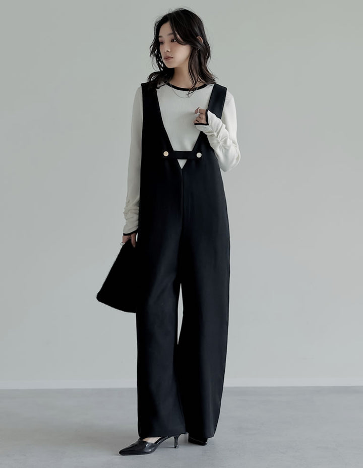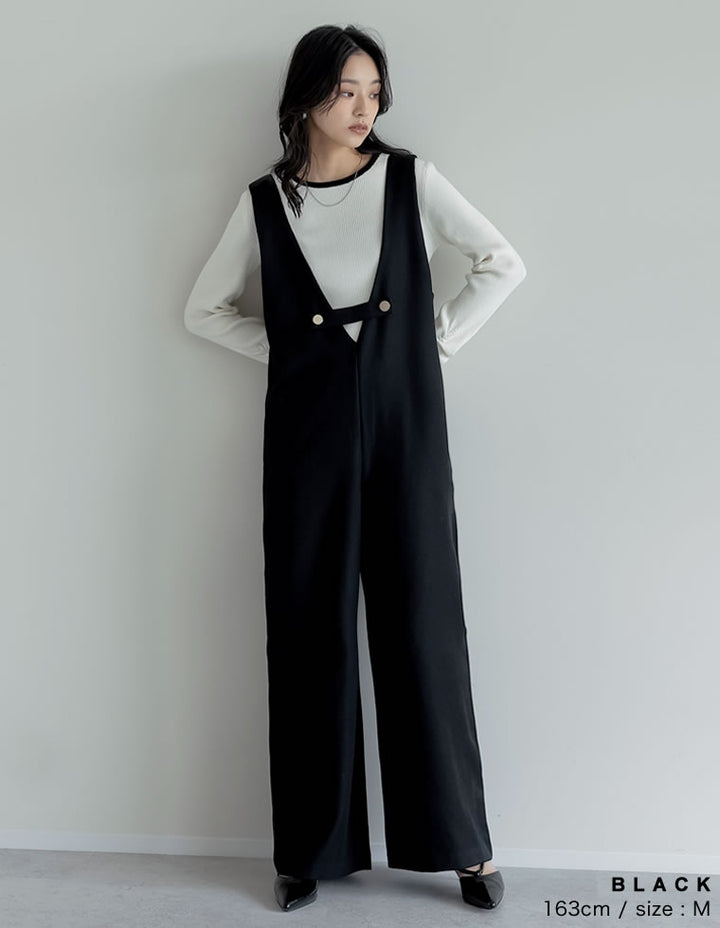 フロントの金ボタンが目を惹く、モードかつクラシカルな印象の微起毛ツイルサロペット。すとんと落ちるIラインシルエットは、スタイルアップ効果がありつつヒップまわりの体型カバーも叶えます。すっきりとしたVネックラインで、どんな体型の方にも着やすいデザインに仕上げました。インナーを変えるだけで印象が変わり、デイリー使いはもちろん、お子様の学校行事やちょっとしたお呼ばれシーンにも対応できる万能アイテムです。トレンド感と着心地の良さを兼ね備えた、大人に嬉しい1枚です。