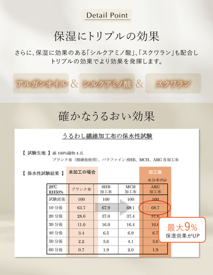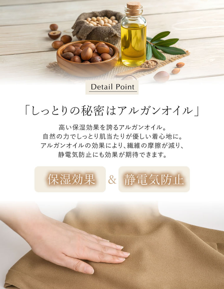 ※アルガンオイル加工の保湿力は永久ではなく、洗濯や着用を繰り返すことにより効果が薄れます。予めご了承ください。
