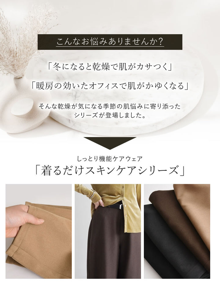 ・アルガンオイル配合で秋冬の乾燥対策に・肌のカサつきを抑え、静電気も起こりにくい ・敏感肌で生地のチクチクが気になる方にもおすすめ・きちんと感のある微起毛ツイル素材で通勤服としても◎・低身長・高身長サイズありで、自分に合ったサイズが選べる