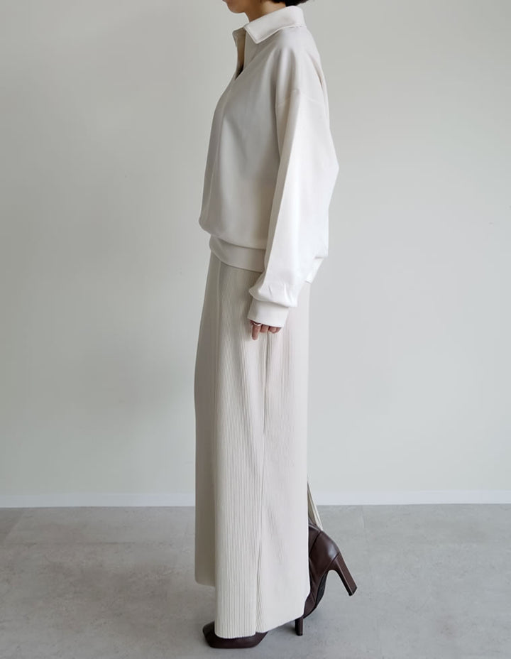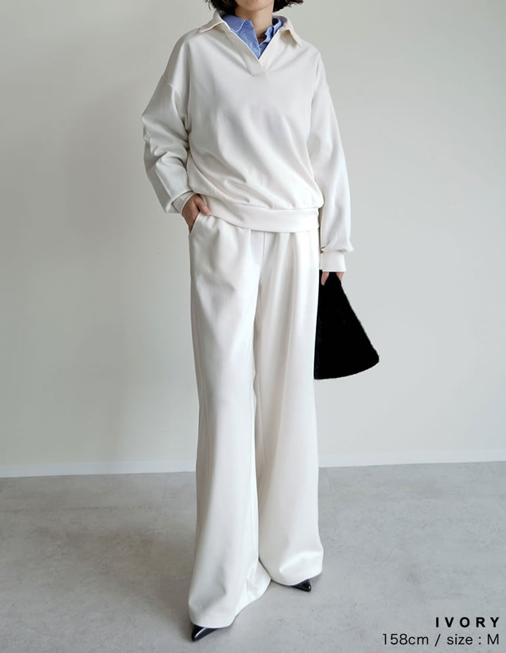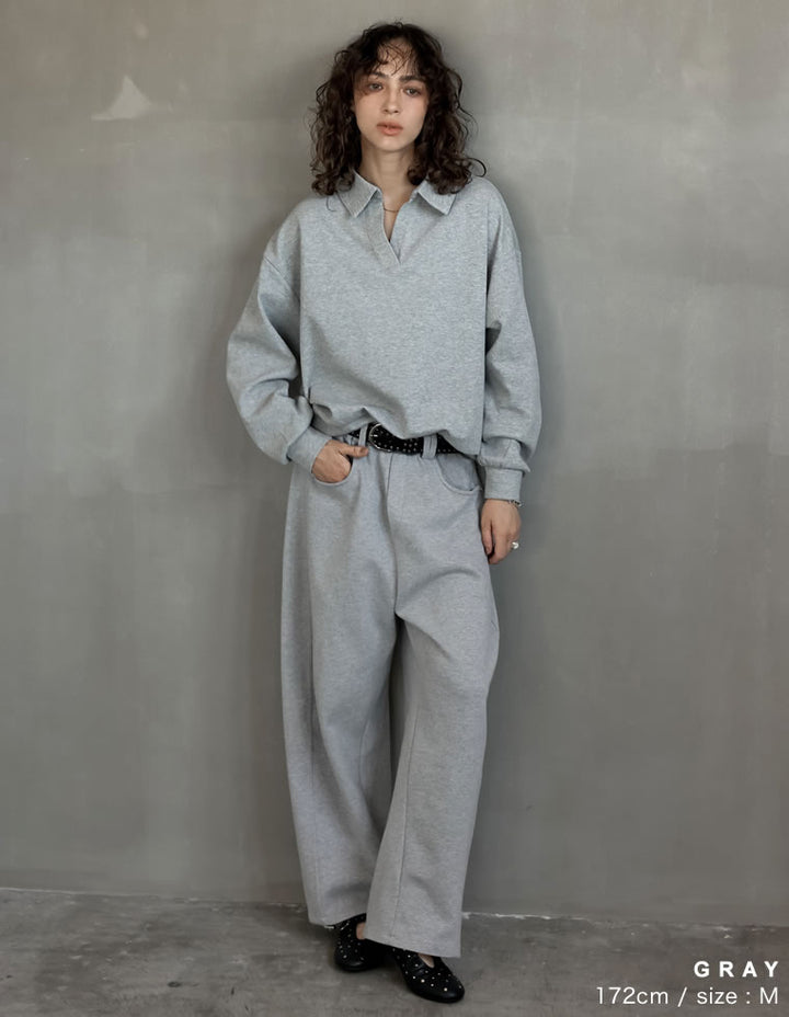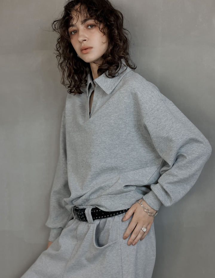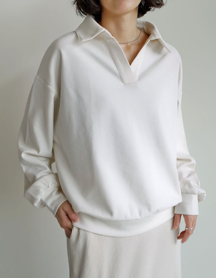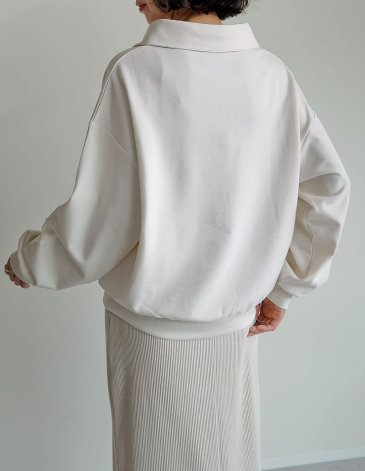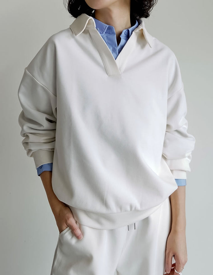 スウェットのようなカジュアルさに、きれいめなネックラインを掛け合わせることで、大人の抜け感を演出。