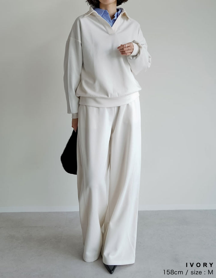 同素材のトップスを合わせれば、洗練されたワントーンスタイルに。