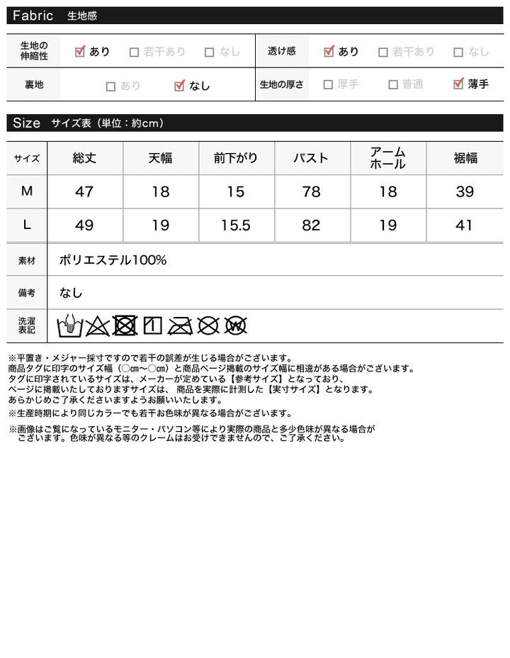 サイズ | 総丈 | 天幅 | 前下がり | バスト | アームホール | 裾幅 |
