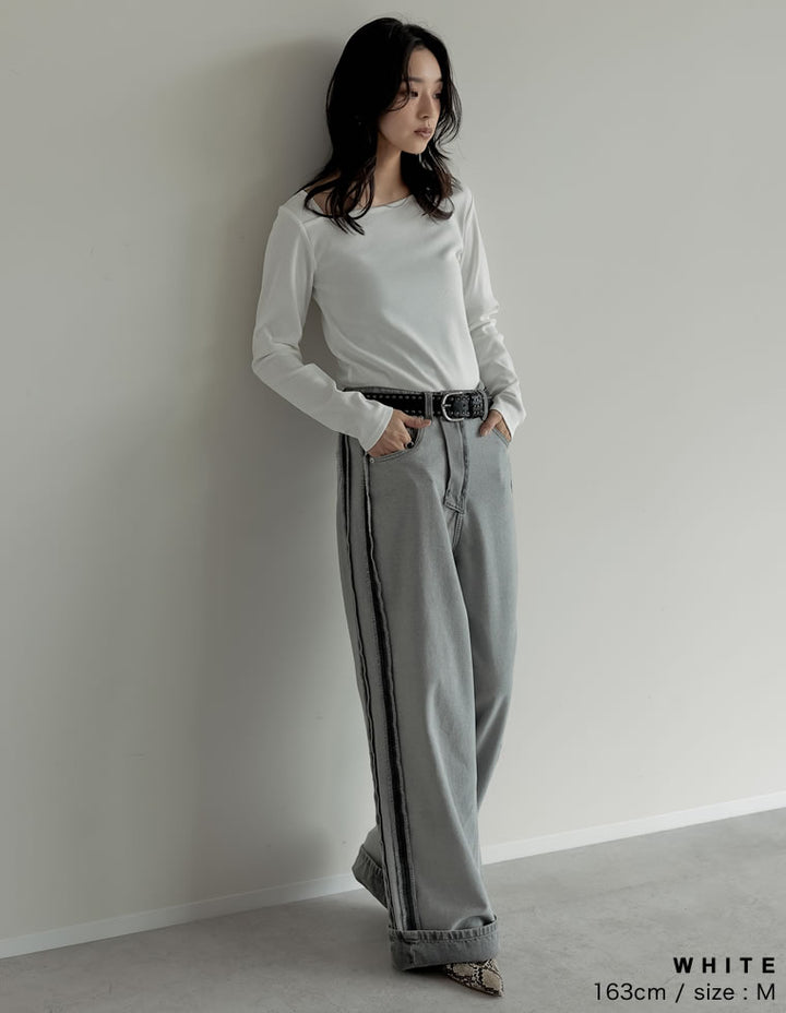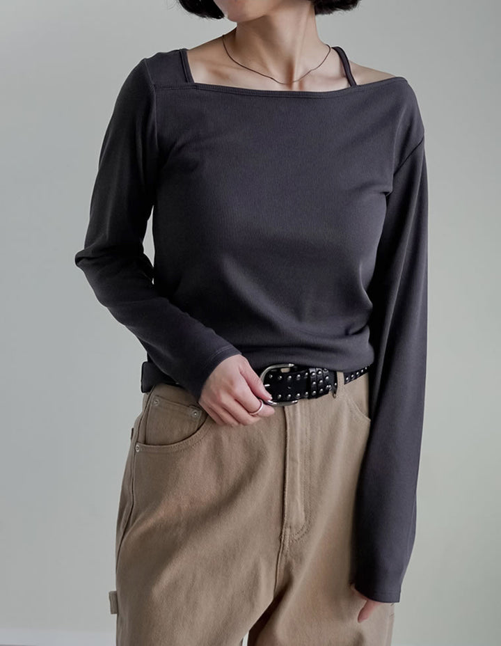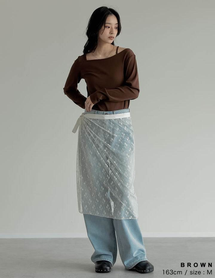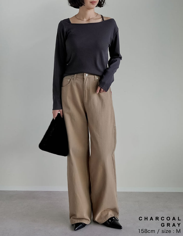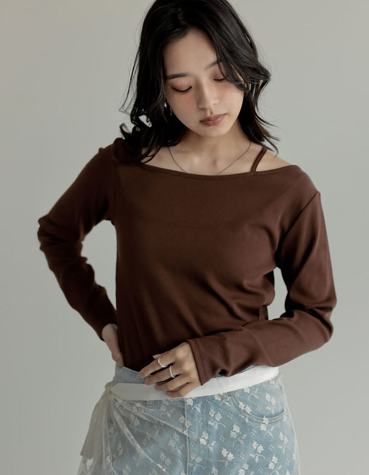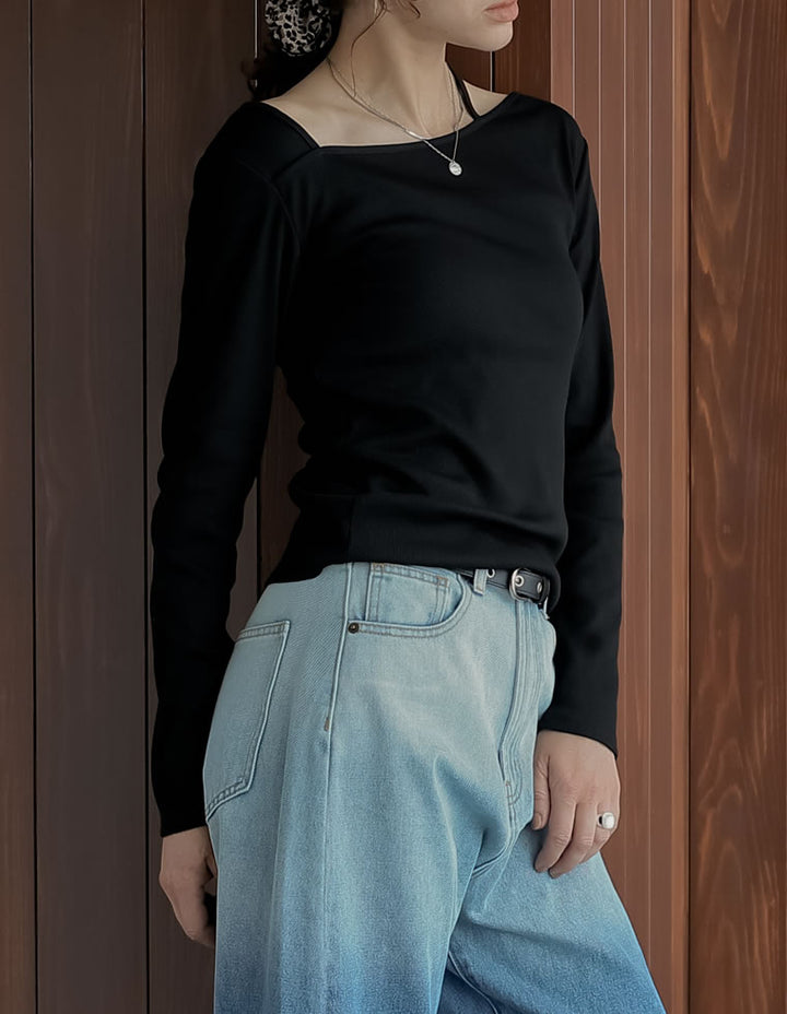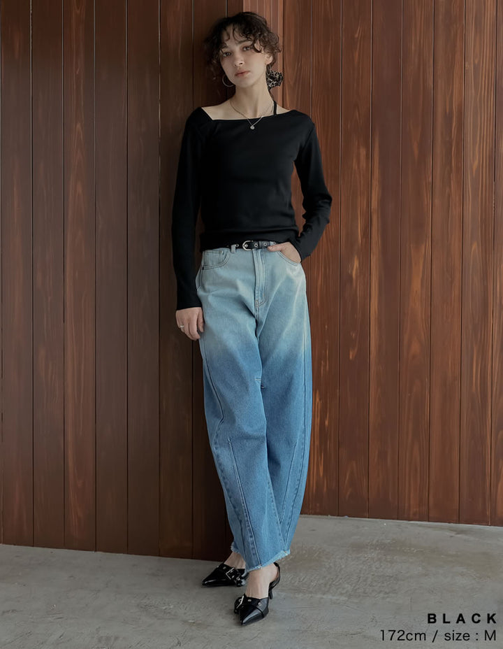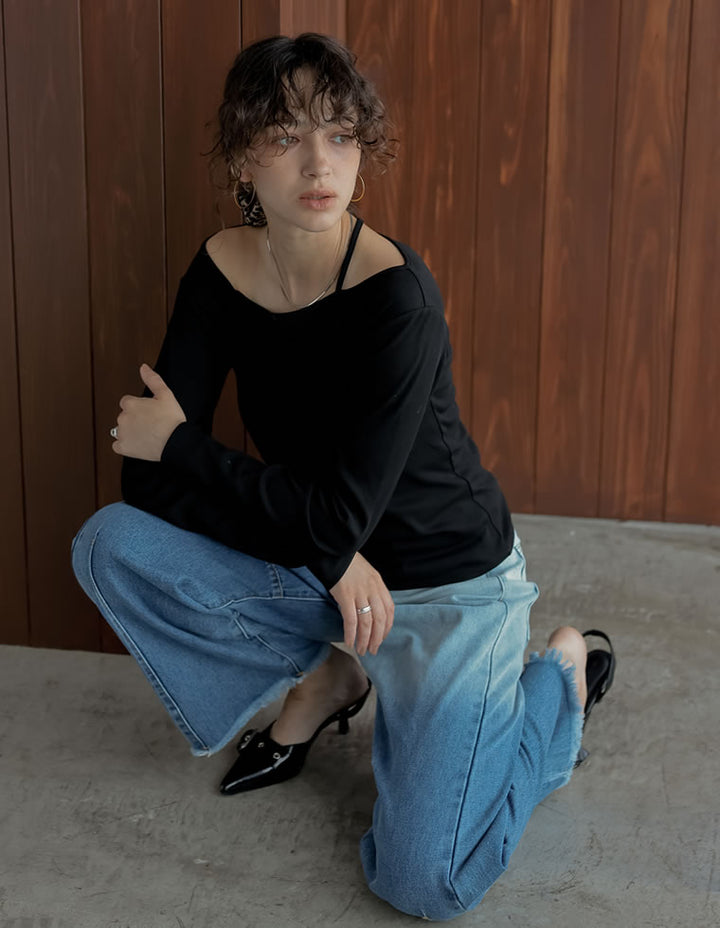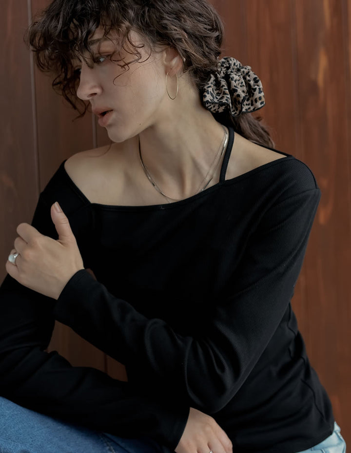 シンプルでありながら、一枚で今年らしさを漂わせるアシンメトリーネックデザイントップス。