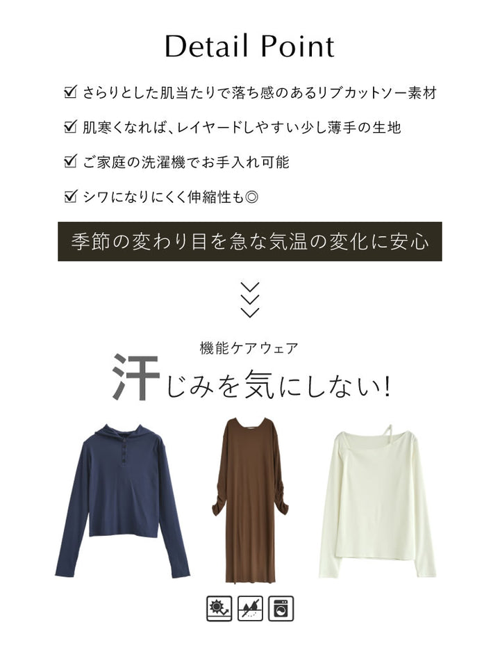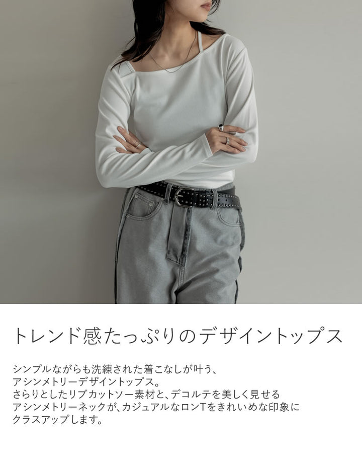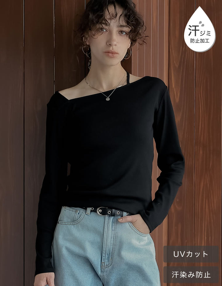汗ジミ防止×UVカット効果を施した、機能性にも優れた一枚。さらりとしたリブカットソー素材を使用し、程よいフィット感で女性らしいシルエットを引き立てます。デコルテを美しく見せるアシンメトリーなカッティングは、顔まわりに抜け感をプラスし、自然と華やかな印象に。ロンTの気軽さを備えつつ、カジュアルすぎないモード感を演出できるのも魅力。