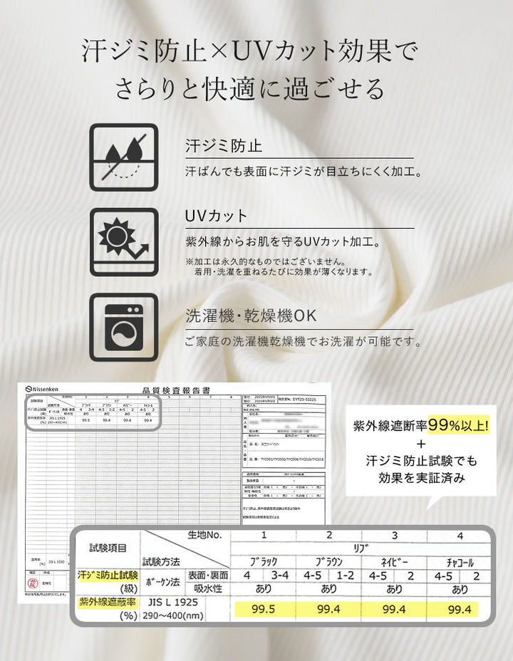 UVカット、汗ジミ防止加工を施した伸縮性のあるリブカットソー