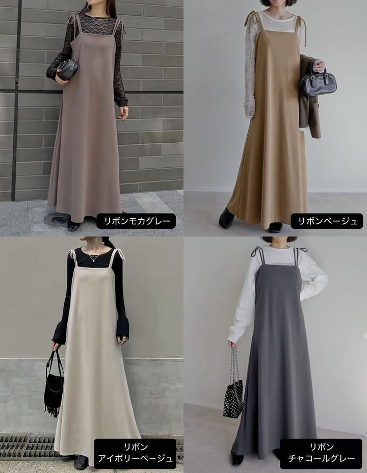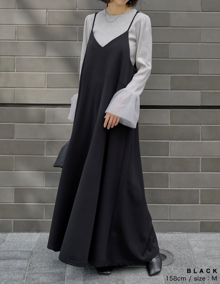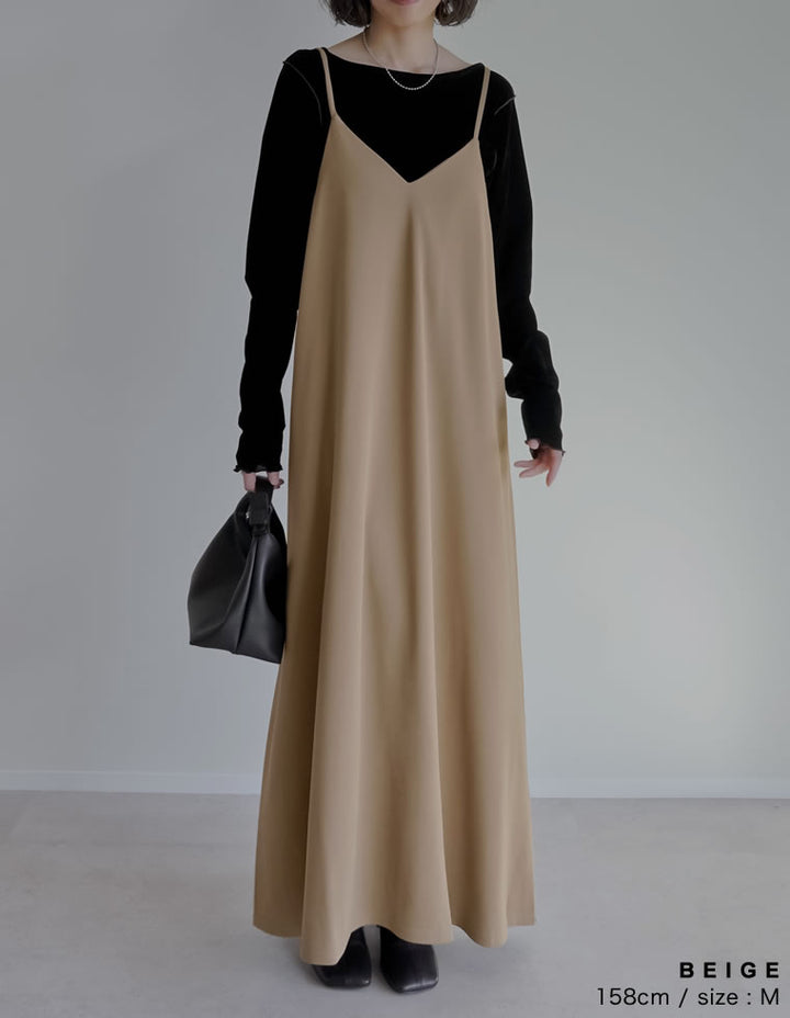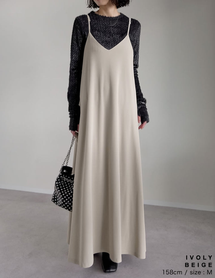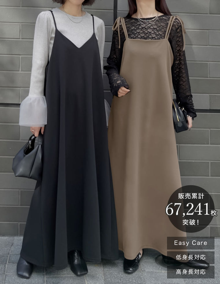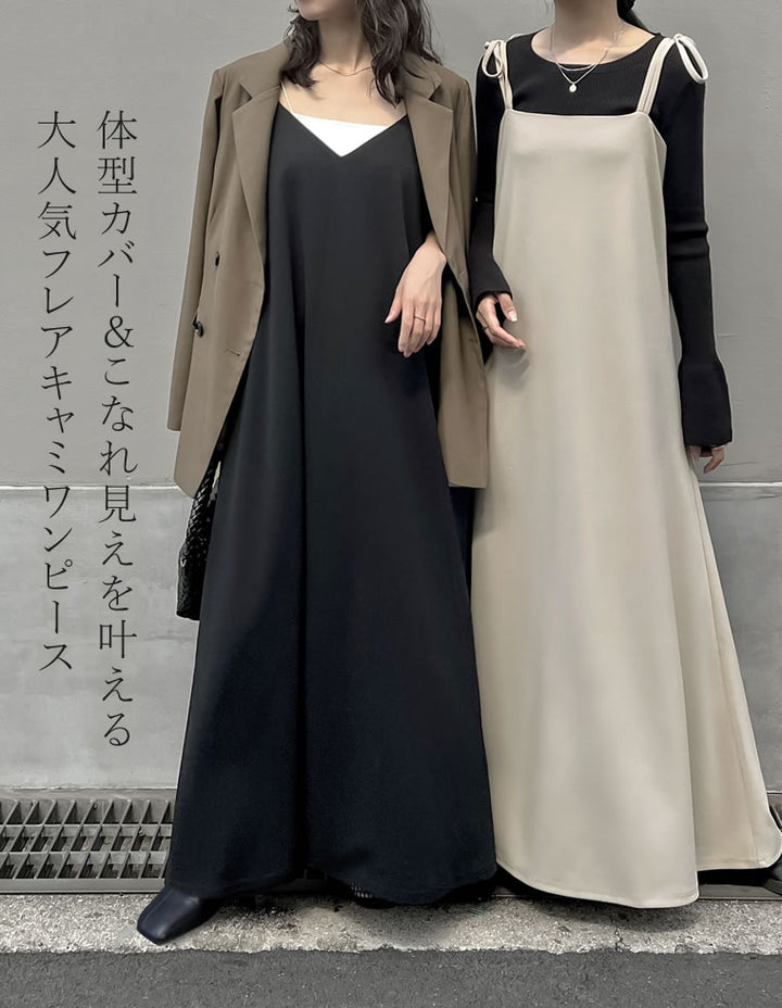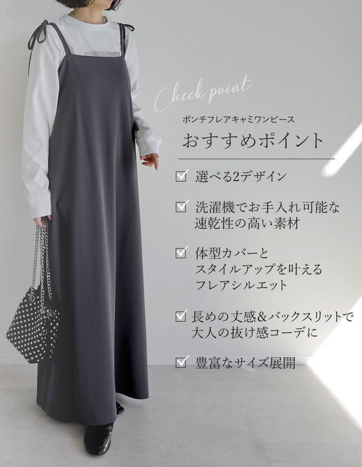 デイリースタイルにぴったりのイージーケアフレアキャミワンピース。