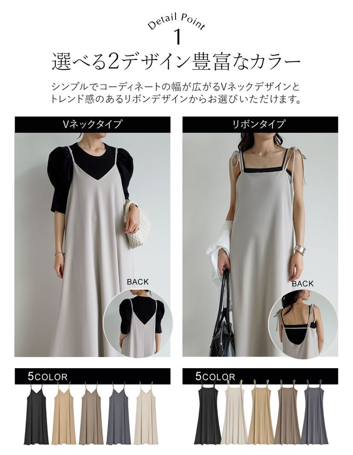 ・シンプルでコーディネートの幅が広がるVネックと、トレンド感のあるリボンデザインの選べる2タイプ・新Ver.のリボンデザインは、フロントがベアスタイル、バックスタイルはすっきりとした印象に・自宅の洗濯機でお手入れ可能&速乾性の高いイージーケア素材・体型カバーとスタイルアップの両方を叶える、大人フェミニンなフレアシルエット・低身長サイズからXLまでの幅広いサイズ展開・長めの丈感&バックスリットで、大人の抜け感コーデに